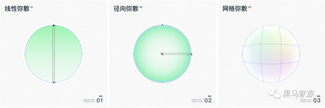 网格弥散手法:通过网格锚点,将不同的颜色散布在“网格”中,叠加得更有层次感。