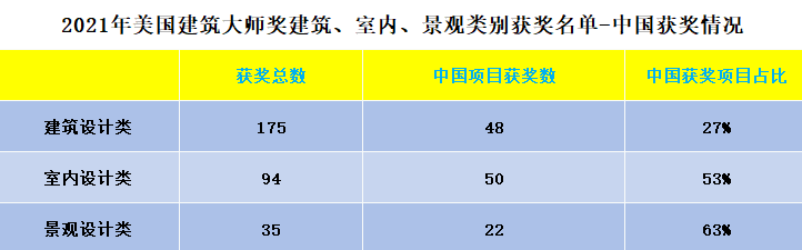 本届建筑设计类共计175个,中国项目斩获48个,占比27%;室内设计类共计94个,中国项目斩获50个,占比53% 。整体而言,中国团队依旧实现了霸榜。