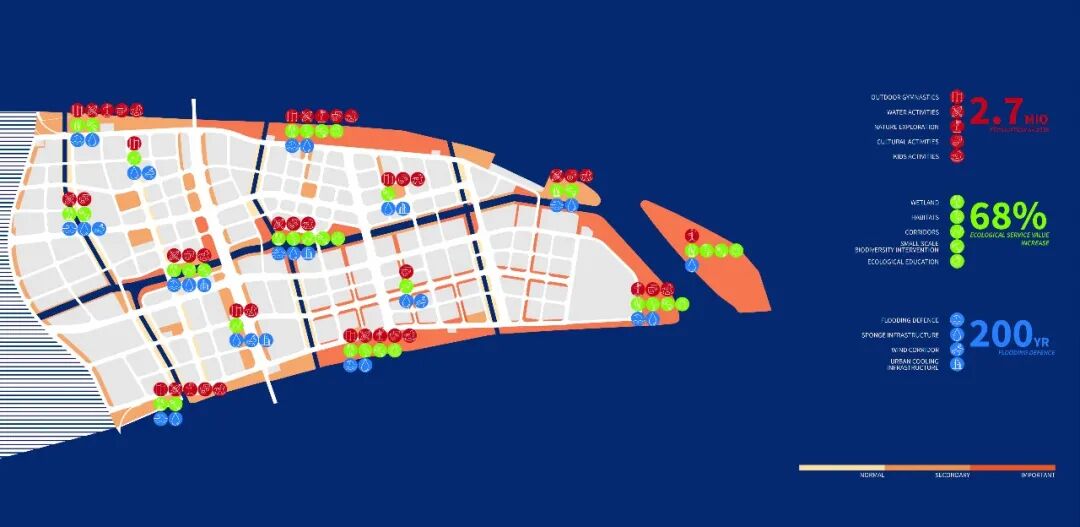 我们借助水动力模型和地理信息系统平台等数字工具,对场地进行水文和景观生态分析,提出各类基于生态系统的设计策略(如潮间带修复、生态海墙、栖息地修复等),旨在借力于生态系统的自适应能力实现城市生长的韧性。