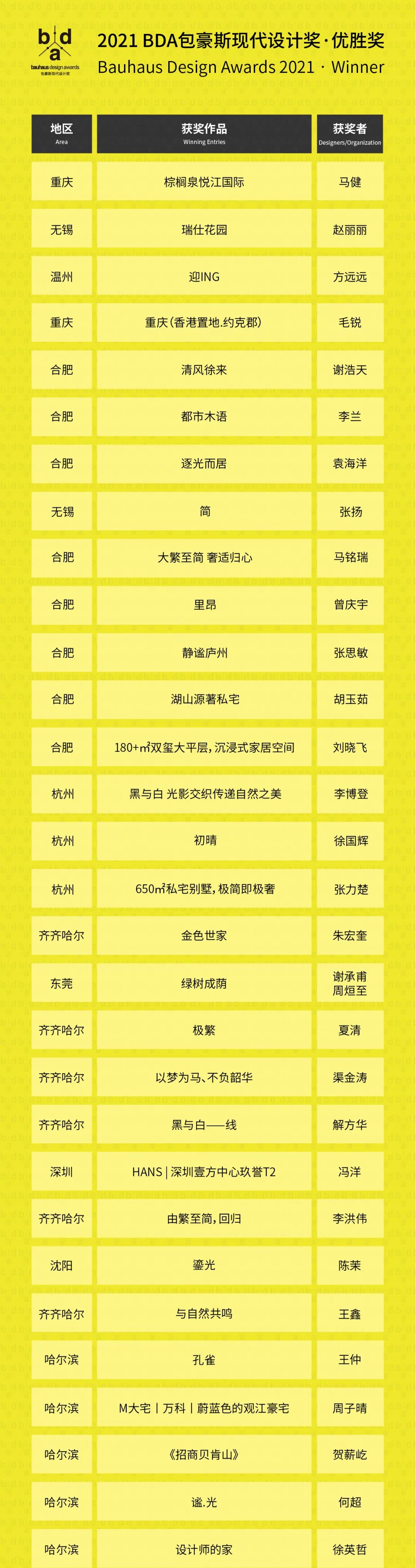 BDA包豪斯现代设计奖于2021年3月正式启动,组委会共收到参评作品760套作品,评委依据评审标准严格评选,最终有152套,涵盖售楼中心、商业空间、私人住宅等类型的设计作品荣膺“2021 BDA包豪斯现代设计奖 · 优胜奖”的殊荣,并于12月12日广州设计周展会同期颁发获奖证书,敬请期待2021BDA包豪斯现代设计奖(优胜奖)颁奖典礼!