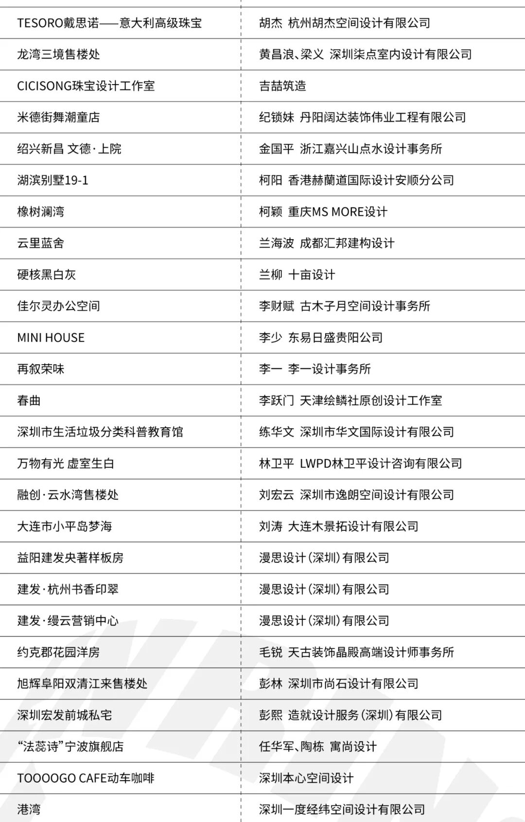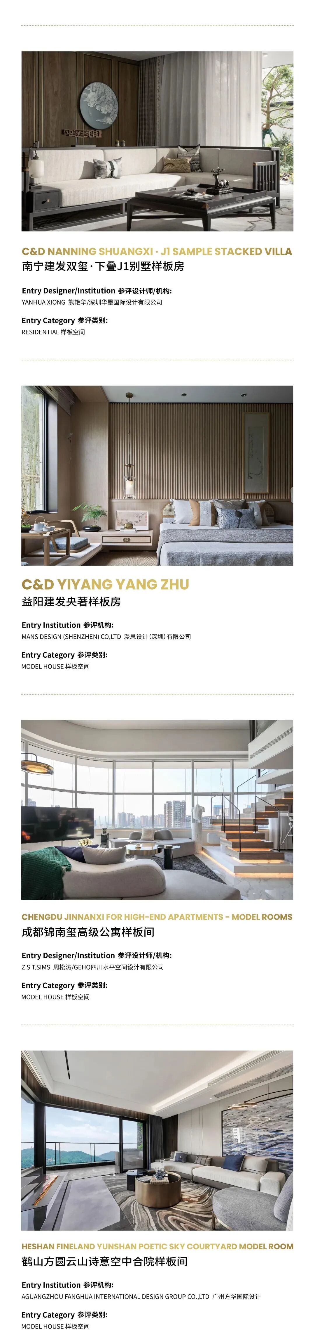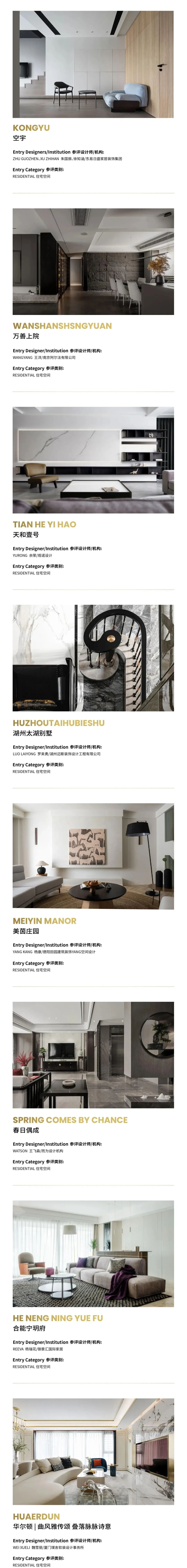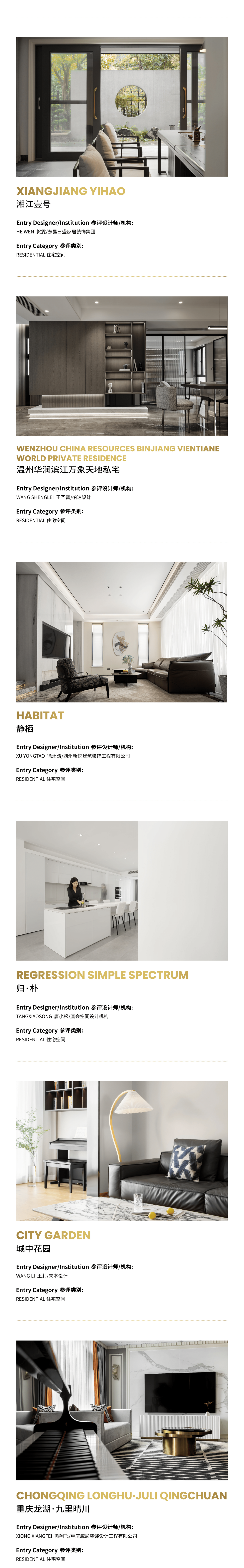 评审委员会根据理念、美学、创新、技巧共四个评审标准从所有参评作品中评选出荣获“2021GRP中意国际设计金指奖·优胜奖”的获奖作品。该奖项自4月21日开启线上参评通道,截至9月15日所有参评作品收集完毕。经由近两个月的评审和筛选,今日2021GRP中意国际设计金指奖·优胜奖”获奖名单正式公布!本次2021GRP中意国际设计金指奖·优胜奖”获奖名单由来自售楼空间、会所空间、样板空间、住宅空间、零售空间、办公空间、餐饮空间、酒店空间、展览空间和公共空间共10个空间类别的204套作品组成。(*以下参评设计师/机构排序不分先后)