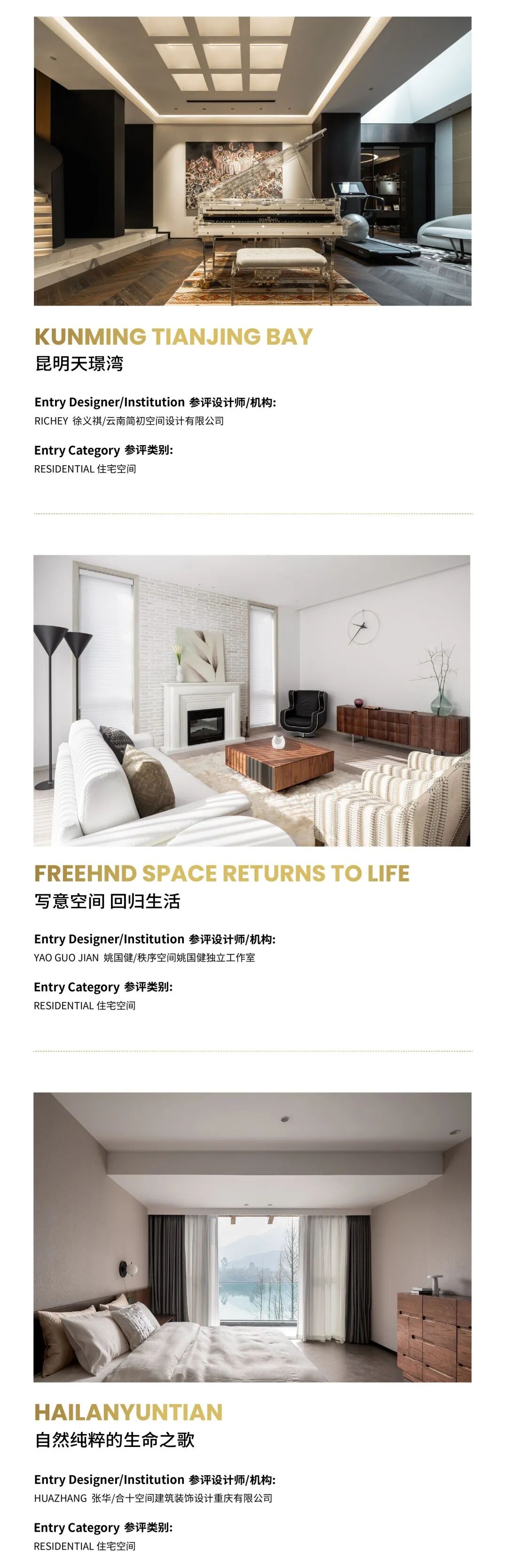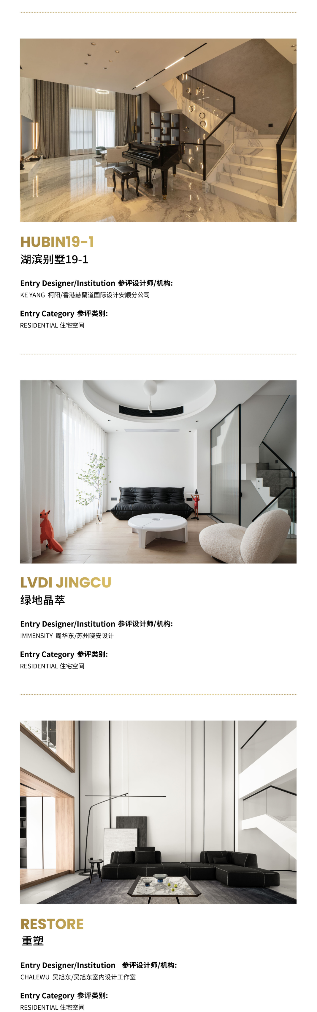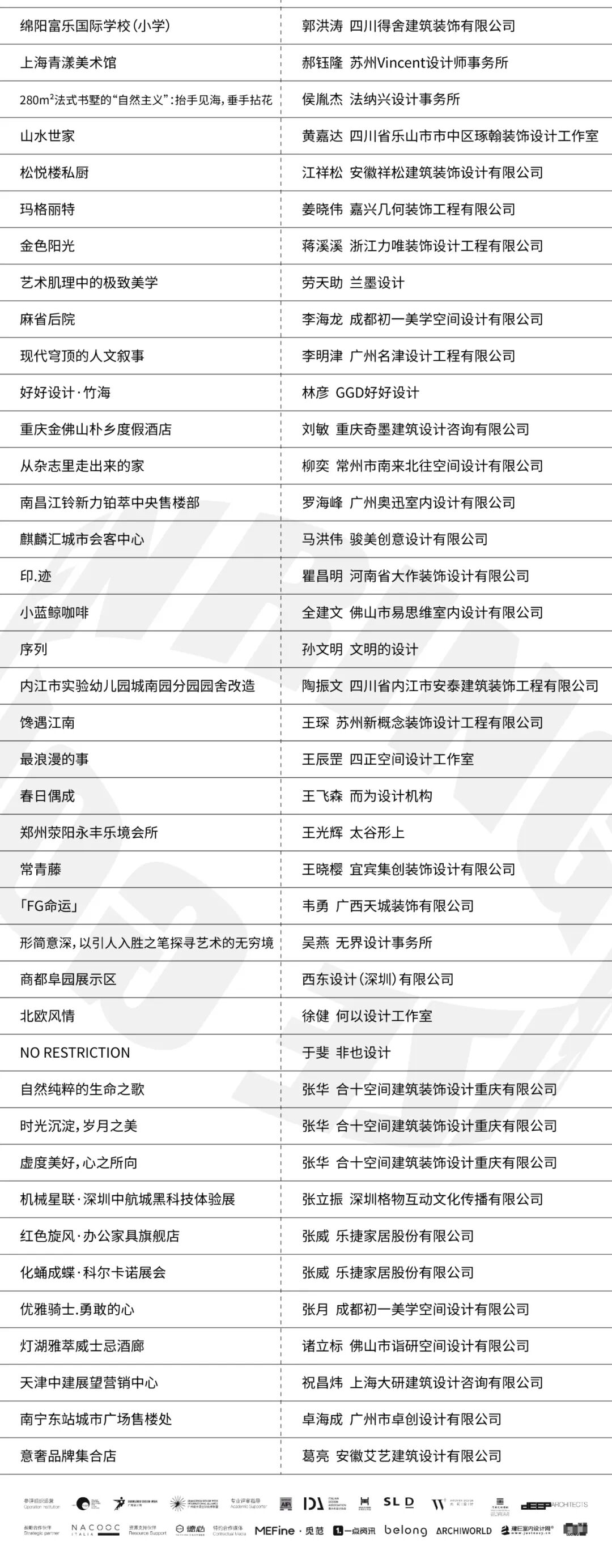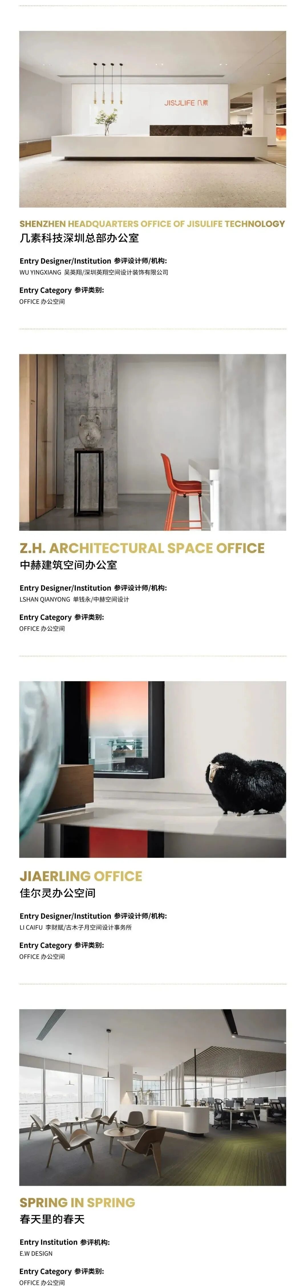 评审委员会根据理念、美学、创新、技巧共四个评审标准从所有参评作品中评选出荣获“2021GRP中意国际设计金指奖·优胜奖”的获奖作品。该奖项自4月21日开启线上参评通道,截至9月15日所有参评作品收集完毕。经由近两个月的评审和筛选,今日2021GRP中意国际设计金指奖·优胜奖”获奖名单正式公布!本次2021GRP中意国际设计金指奖·优胜奖”获奖名单由来自售楼空间、会所空间、样板空间、住宅空间、零售空间、办公空间、餐饮空间、酒店空间、展览空间和公共空间共10个空间类别的204套作品组成。(*以下参评设计师/机构排序不分先后)