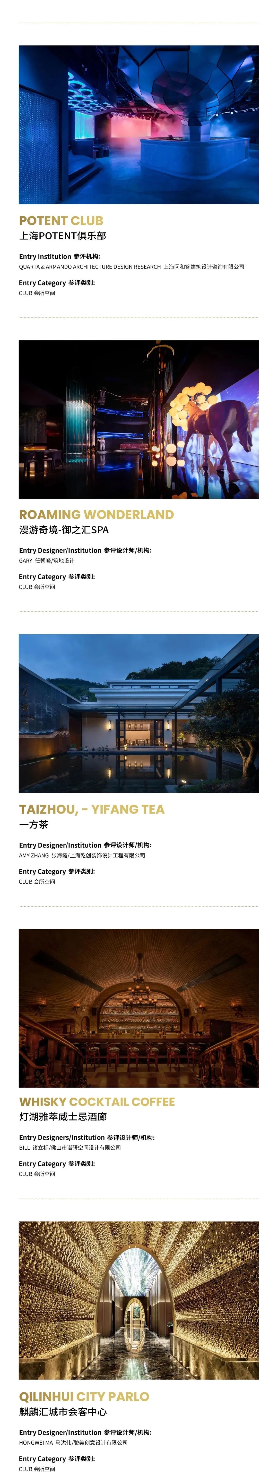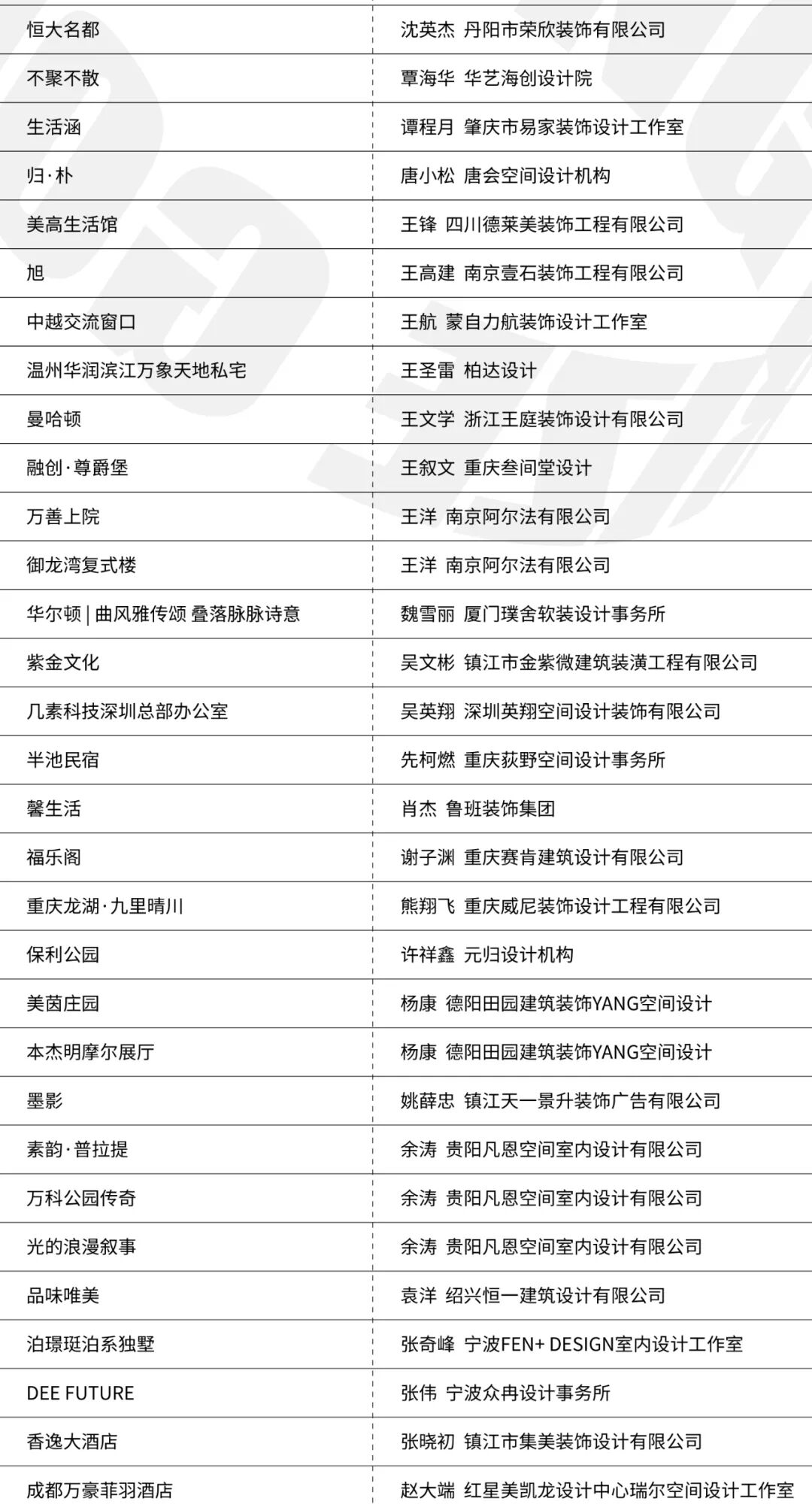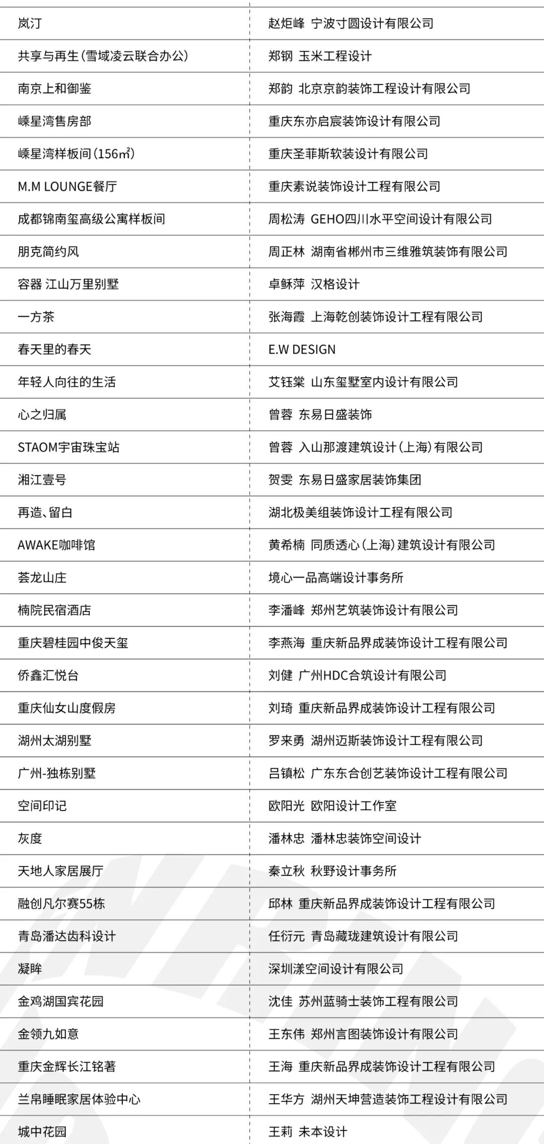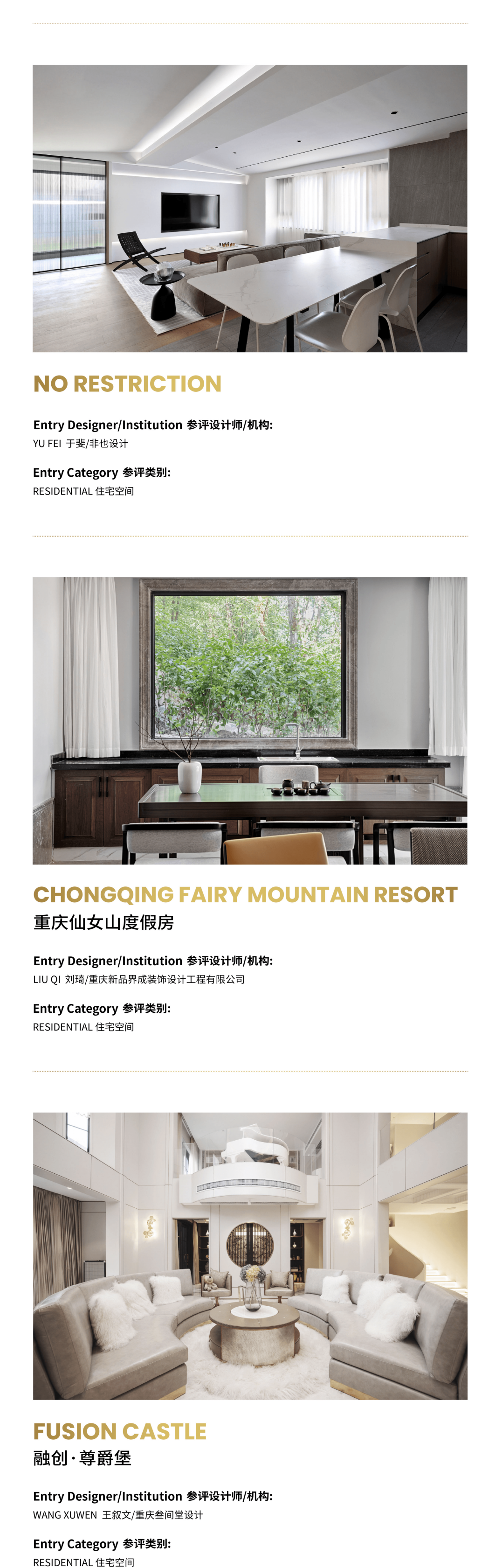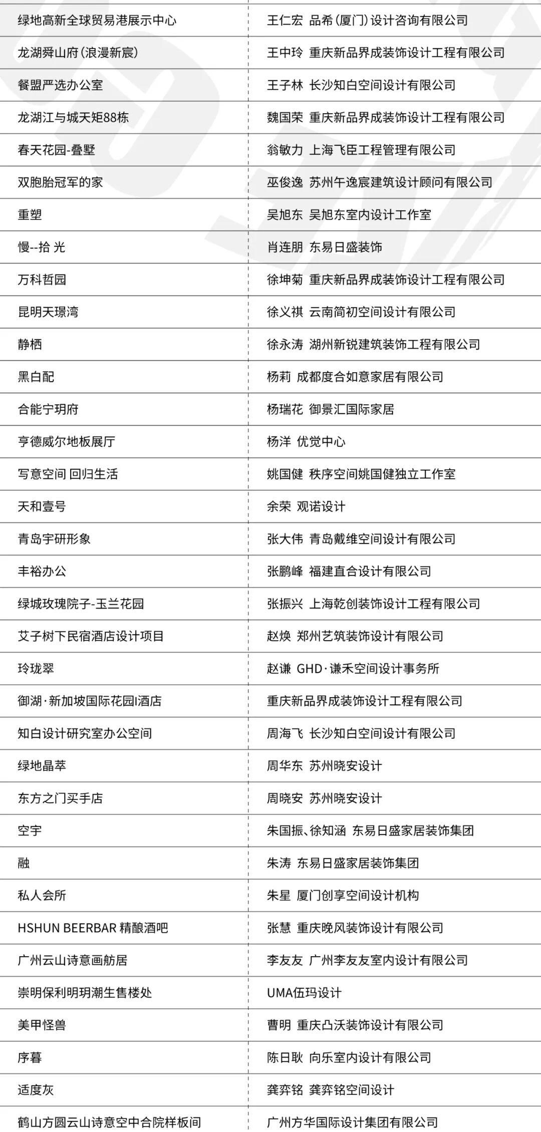 评审委员会根据理念、美学、创新、技巧共四个评审标准从所有参评作品中评选出荣获“2021GRP中意国际设计金指奖·优胜奖”的获奖作品。该奖项自4月21日开启线上参评通道,截至9月15日所有参评作品收集完毕。经由近两个月的评审和筛选,今日2021GRP中意国际设计金指奖·优胜奖”获奖名单正式公布!本次2021GRP中意国际设计金指奖·优胜奖”获奖名单由来自售楼空间、会所空间、样板空间、住宅空间、零售空间、办公空间、餐饮空间、酒店空间、展览空间和公共空间共10个空间类别的204套作品组成。(*以下参评设计师/机构排序不分先后)