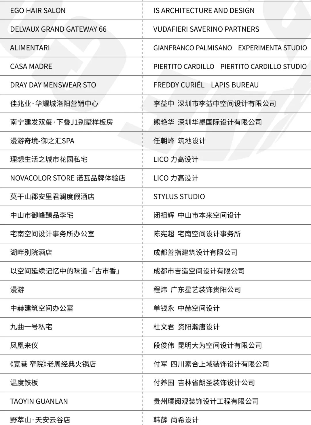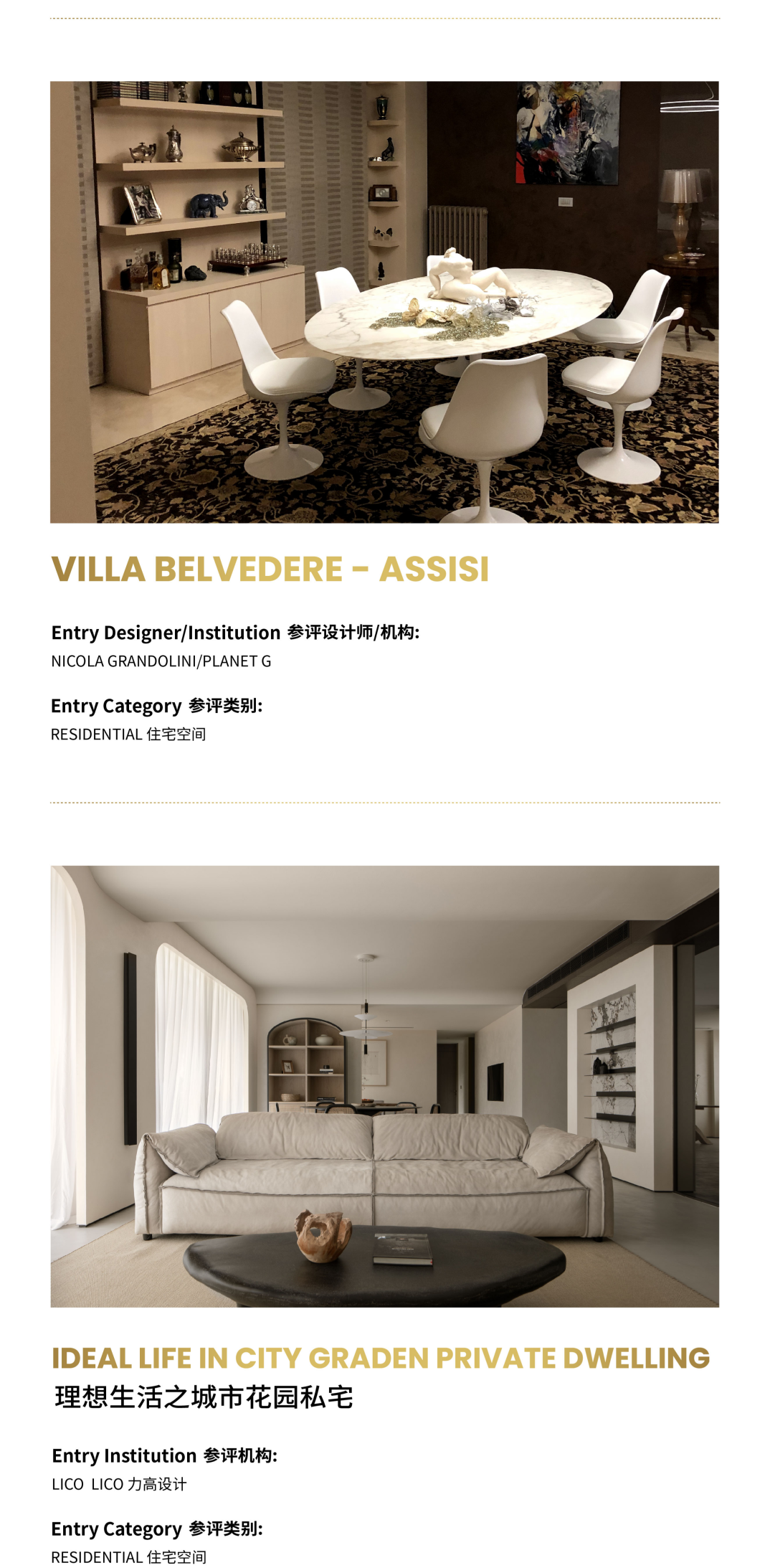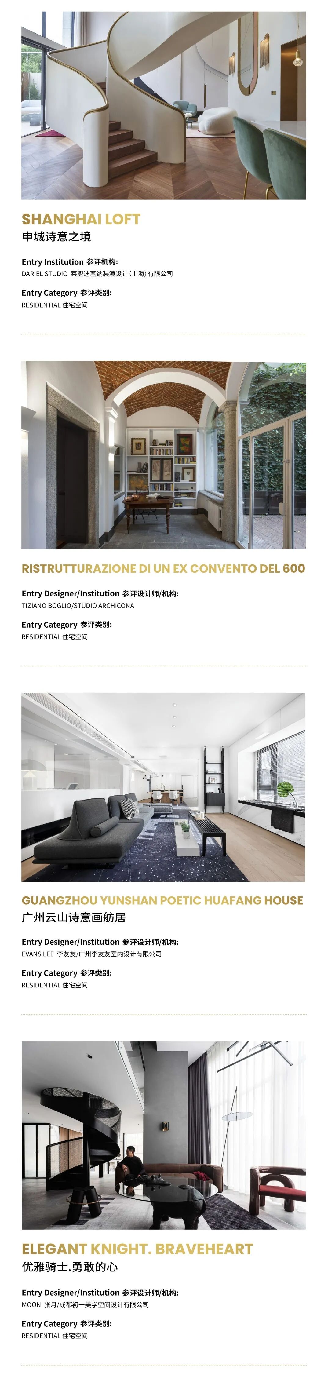 专业评审指导:Italian Interior Designers Association 意大利室内设计师协会(AIPI))、意大利室内设计师协会、MARCO PIVA 设计室、UAINOT、Claudio Nardi Architects、梁志天设计集团 (SLD)、无间设计、北京王开方艺术设计工作室、中国美术学院国艺城市设计艺术研究院、dEEP Architects