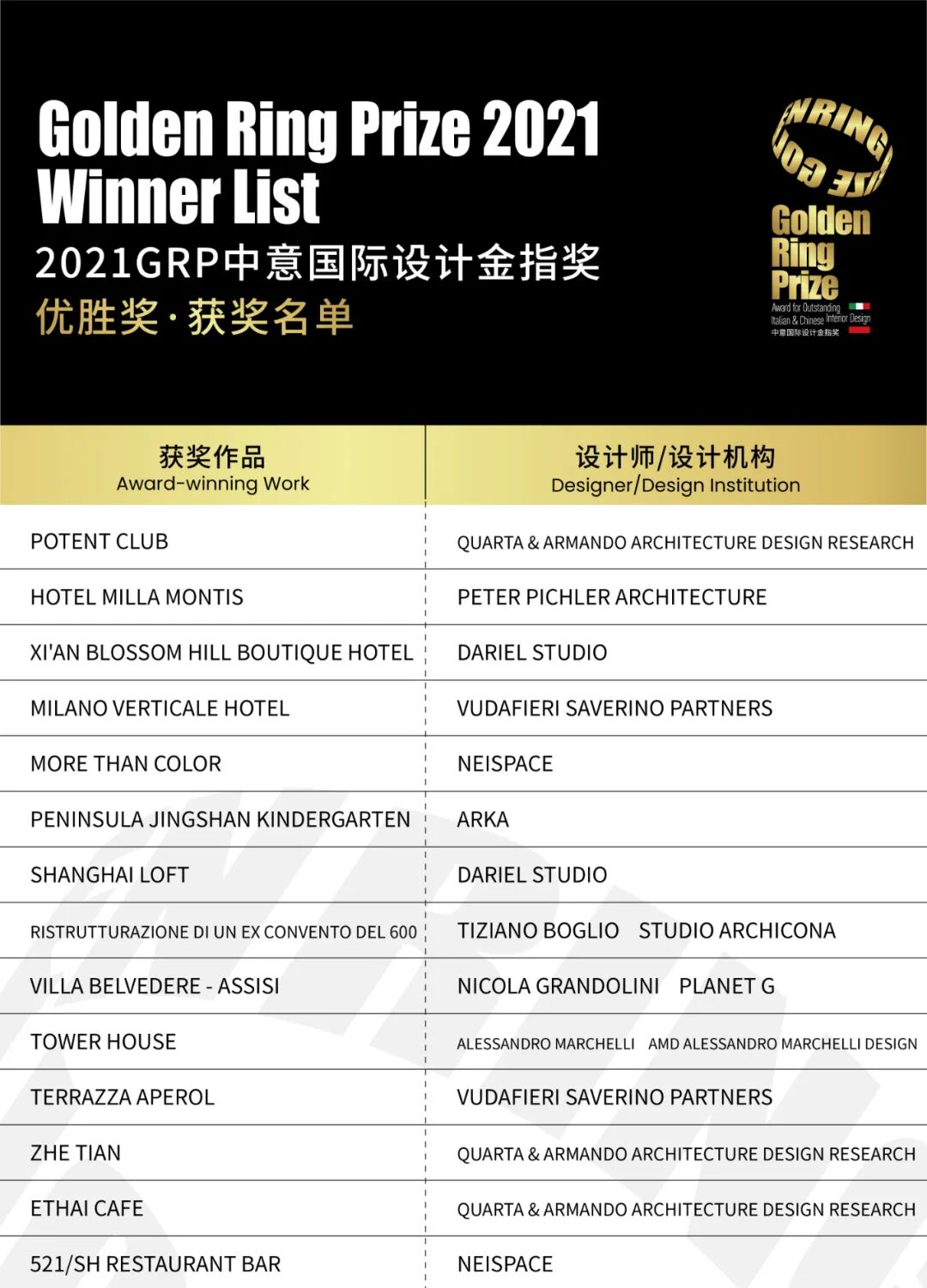 GRP中意国际设计金指奖——中意杰出设计交流计划,由来自中意两国的权威设计组织领袖、资深设计专家组成评审委员会,每年度遴选中意两国在零售、住宅、办公、酒店设计等空间领域的杰出作品和新锐设计师,助力于中意两国设计与文化上的交流与融合。再次祝贺以上荣获2021GRP中意国际设计金指奖·优胜奖(Golden Ring Prize 2021 Winner)的作品!Congratulations!