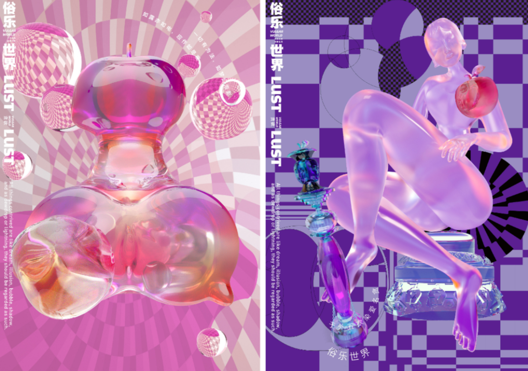 作品简介:俗乐世界与佛教中西方极乐世界的概念相反,西方极乐世界是佛教徒修行的最高境界,而俗乐世界却是充斥着极具诱惑的人间。佛教把“贪”视作五毒之首,“于外五欲染爱名贪。”在俗世里,有人因贪欲掉进消费主义和精致享乐主义的陷阱里,有人被现代化娱乐产物裹挟沉浸在享受快餐式精神刺激中导致丧失延迟满足的能力。人类的贪欲不仅会吞噬自我,更有甚者会危害人与自然共生关系,那些为了满足口腹之欲的人对稀有食物的猎奇心理破坏了自然生态导致地球危机频频爆发,传染病和自然灾害屡见不鲜,归根结底都是现代社会中人对财、色、食、物贪婪的集中表现。