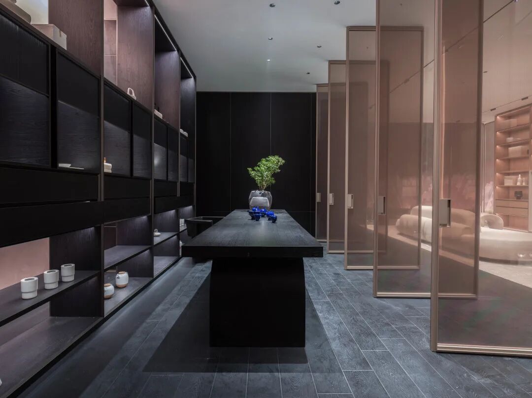 可转动的鞋柜、可升降收纳柜、自动雾化的玻璃展柜……科技感巧妙融入空间的各个角落,让生活更便捷,细腻的关怀无处不在。