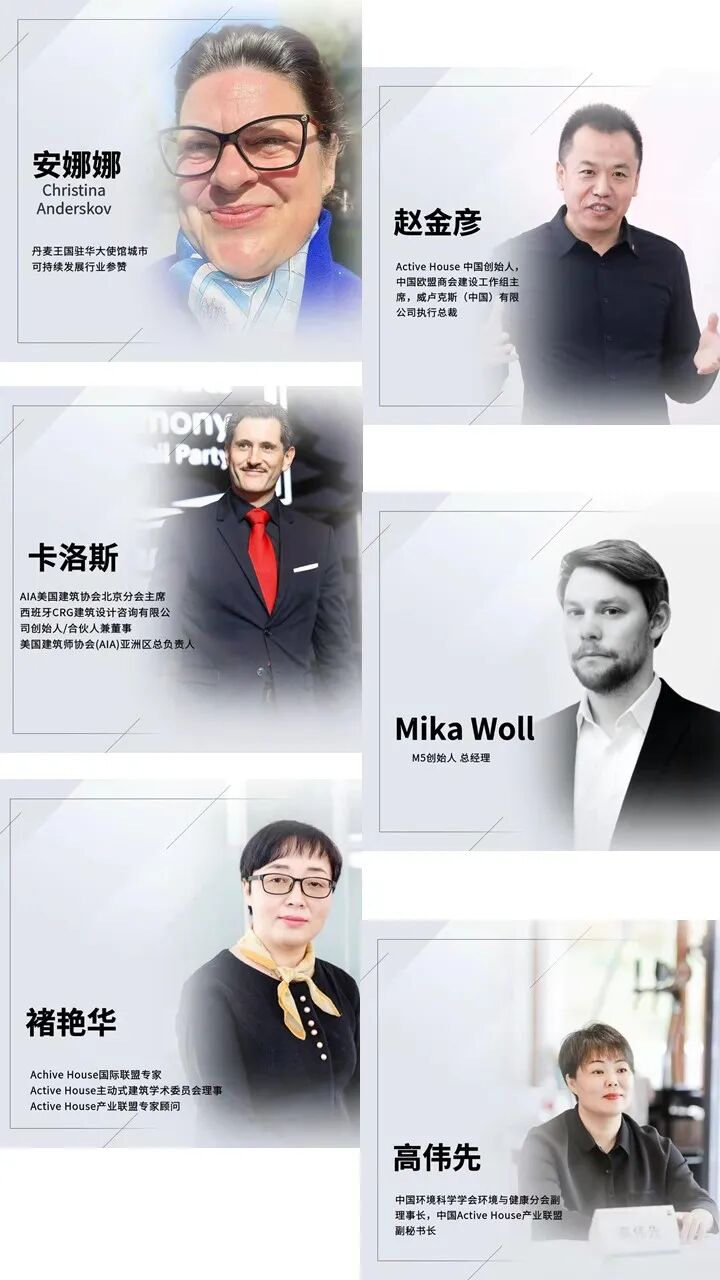 论坛荣幸邀请到丹麦王国驻华大使馆城市可持续发展行业参赞安娜娜Christina AnderskovActive House 中国创始人,中国欧盟商会建设工作组主席,威卢克斯(中国)有限公司执行总裁赵金彦。AIA美国建筑师协会北京分会主席,西班牙CRG建筑设计咨询有限公司创始人/合伙人兼董事,美国建筑师协会(AIA)亚洲区总负责人卡洛斯Carlos GomezM5创始人,总经理Mika WollAH国际联盟专家,AH主动式建筑学术委员会理事,AH产业联盟专家顾问褚艳华中国环境科学学会环境与健康分会副理事长,中国AH产业联盟副秘书长高伟先
