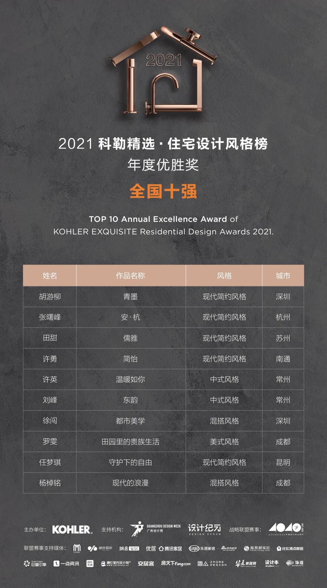 星光熠熠,不负荣光。多元赛制自驱升级,媒体流量破圈发声,2021科勒精选·住宅设计风格榜不断助力设计行业新生力量梦想启航,在此祝贺以上荣获“年度卓越奖TOP10”的设计师及设计机构!