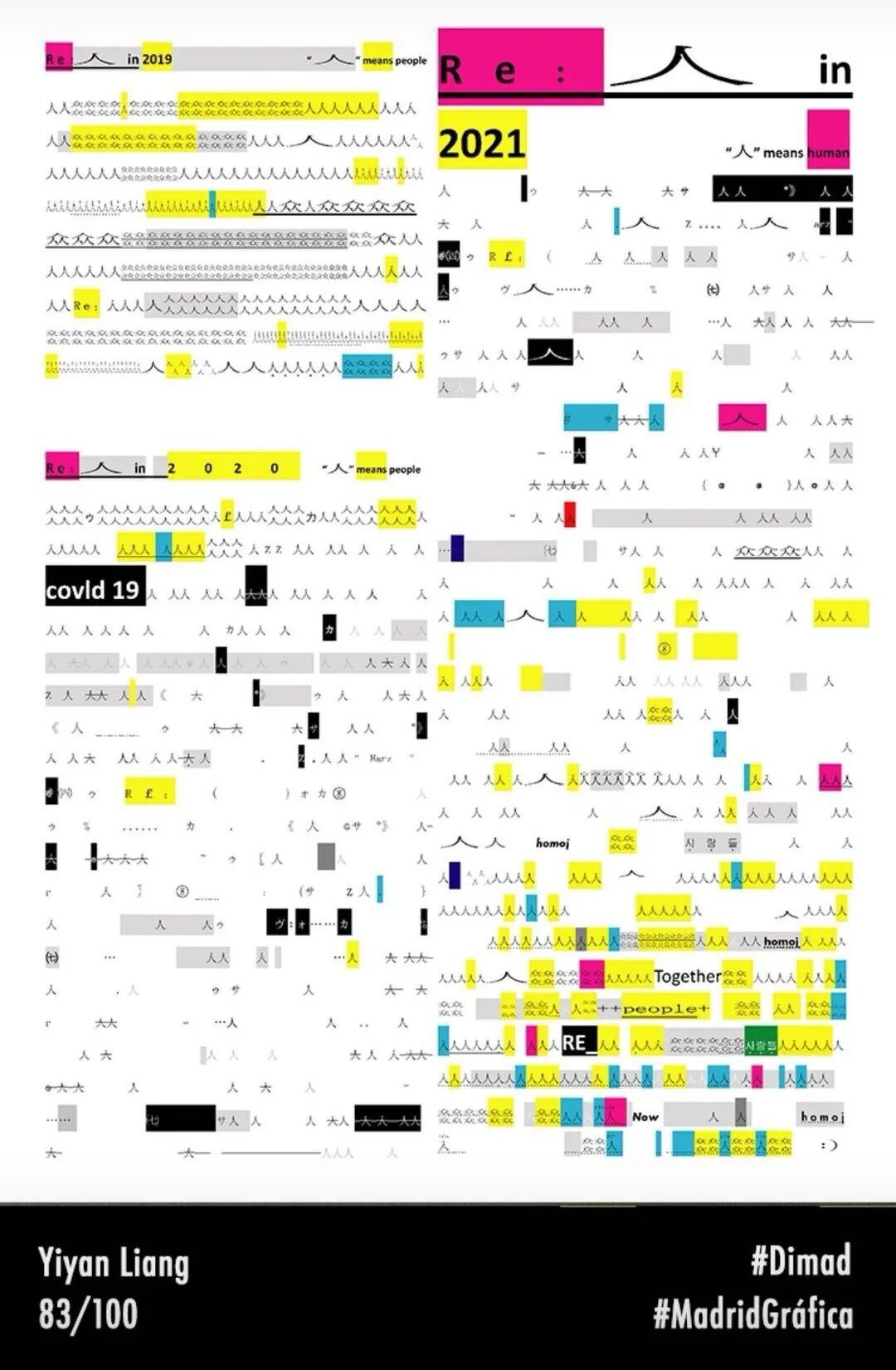 本届的主题是:Re_,表达重启、复兴、恢复之意。旨在激发人们对当下全球后疫情时代的深度思考。组委会从来自世界各地数百名设计师提交的海报中,评选出100件优秀作品(其中有27件中国设计师作品),于9月15日至10月21日在马德里胡安·戈伊蒂索洛广场(Plaza Juan Goytisolo)和东方广场(Plaza de Oriente)组织了这一大型展览活动。