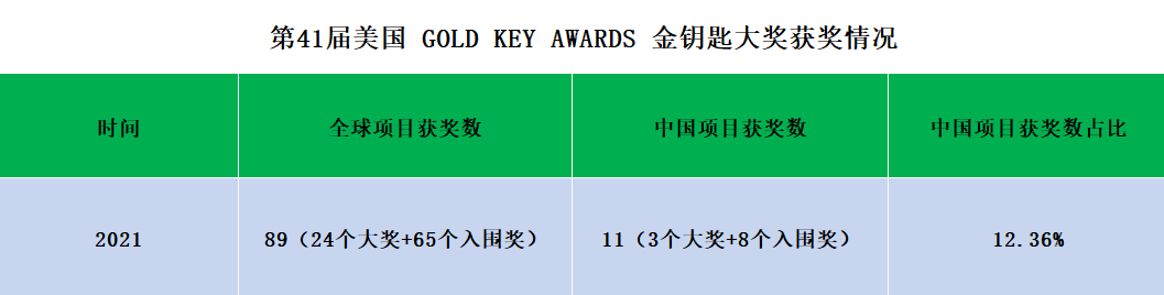 被誉为“全球酒店设计最高荣誉”的金钥匙奖(GOLD KEY AWARDS),于11月15日在纽约举行颁奖典礼,隆重揭晓2021年度获奖名单(年度设计师+评委特别奖+23个类别大奖&入围奖)。据官方数据统计,本届金钥匙大奖共收到来自全球100多家设计公司的近400份参赛作品,经过评委评审,最终共89个项目获奖(24个大奖+65个入围奖),其中中国项目11个(3个大奖+8个入围奖),占比12.36%。