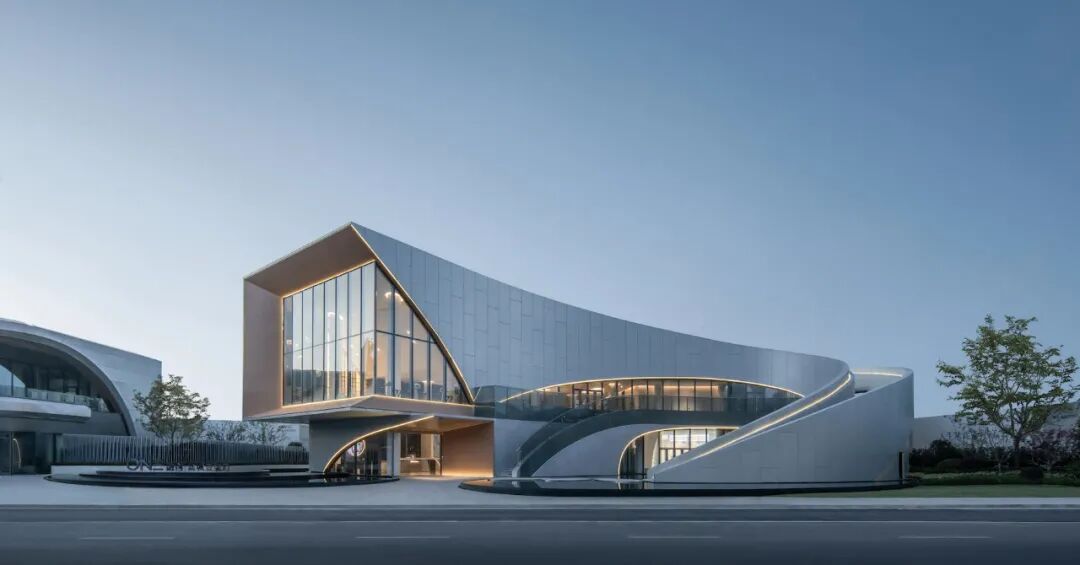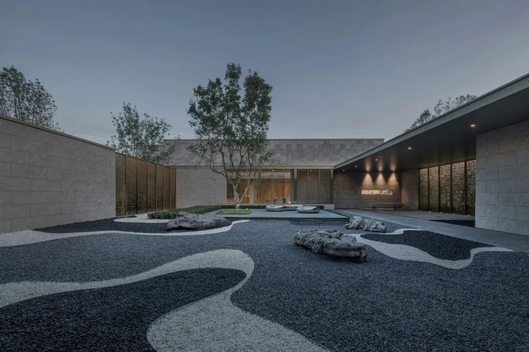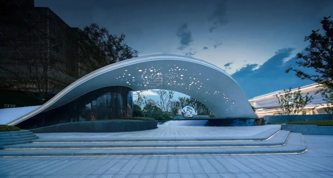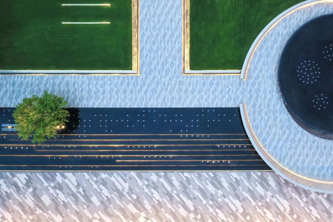 项目最大亮点为采用170万块不同大小尺寸、14种颜色深浅不一的陶砖对建筑、景观、室内进行一体化打造。景观空间包含三座极致曲线广场,大尺度的空间构图予以陶砖砌筑与黑色砾石、植物的组合,彰显力量感。