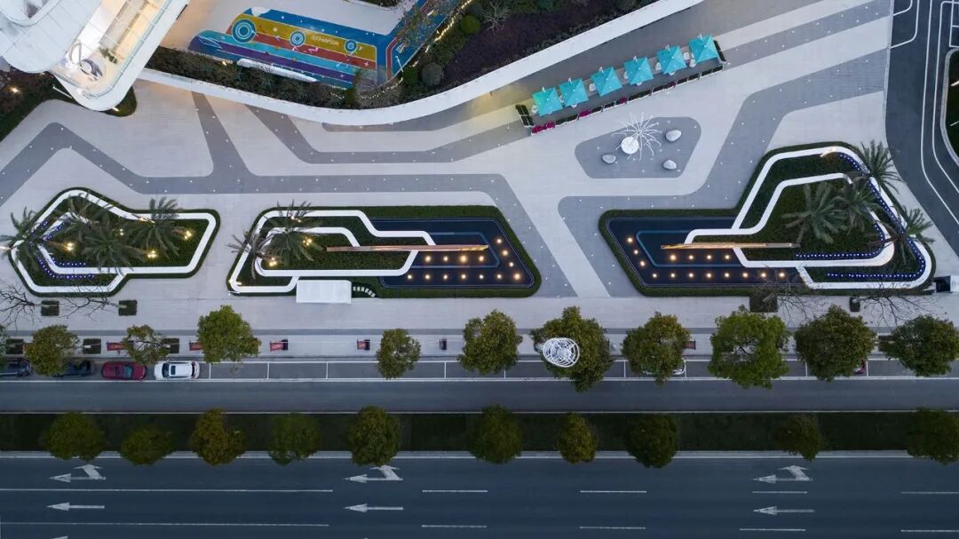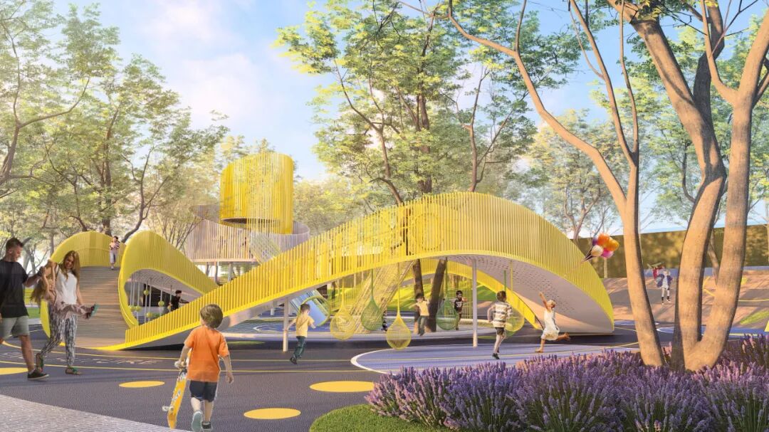 景观别出心裁地串联通体明亮的建筑结构,由上至下创造天空乐园屋顶、兼顾成长和呵护功能的中庭以及交流城市广场。简洁优雅的线性韵律,激活多维空间活力,同时传递儿童的无限潜力。