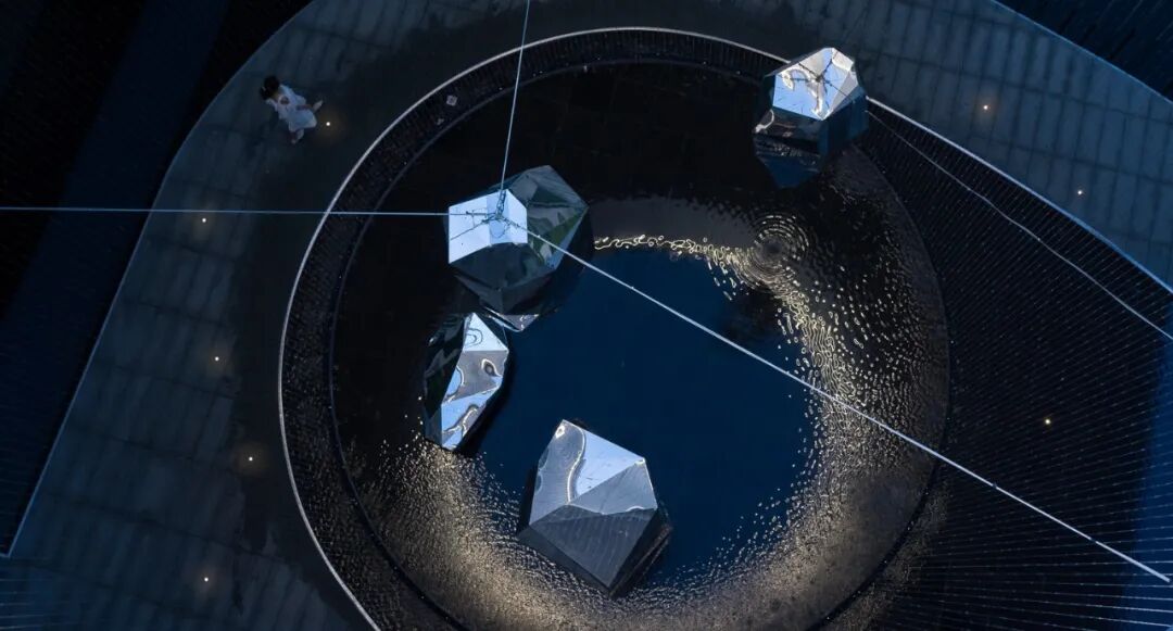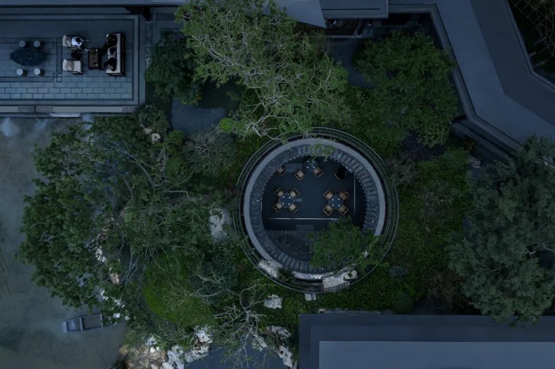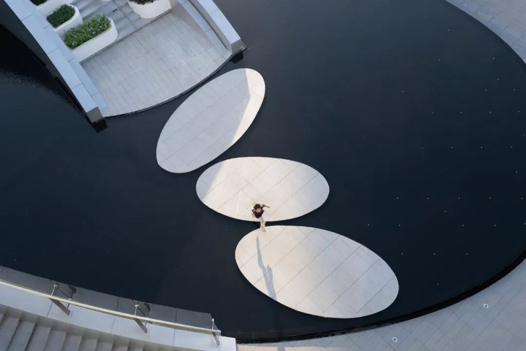 通过极简设计语言抽象化的体量关系,以圆与线的图形去碰撞与融合,再呈现几何构图的视觉美感之后,形成场地的设计语言。