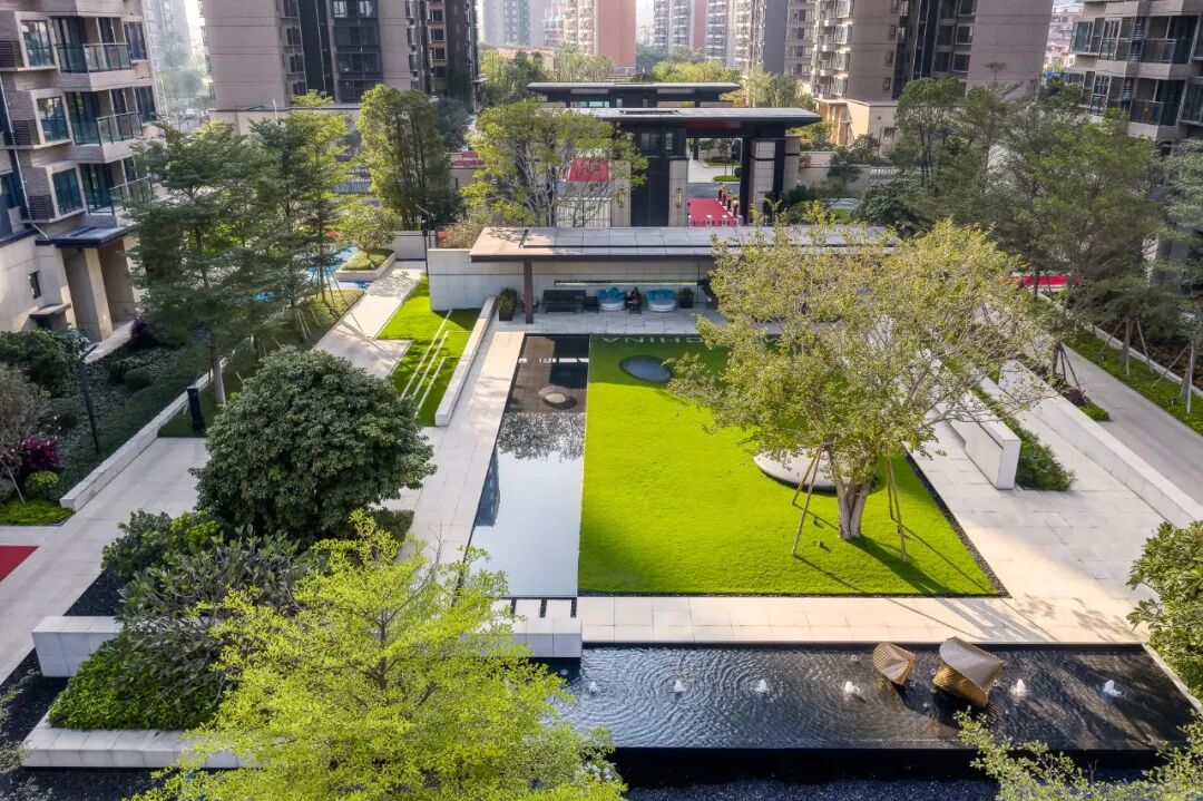 设计将根植于空间中的个人体验,以极简主义大师——密斯·凡德罗“少即是多”的设计理念结合蒙德里安的新造型主义,赋予场地灵魂,让居住场所的生命绵长而有力。并由农芳园林团队负责景观施工营造,最终呈现精致品质的景观效果。