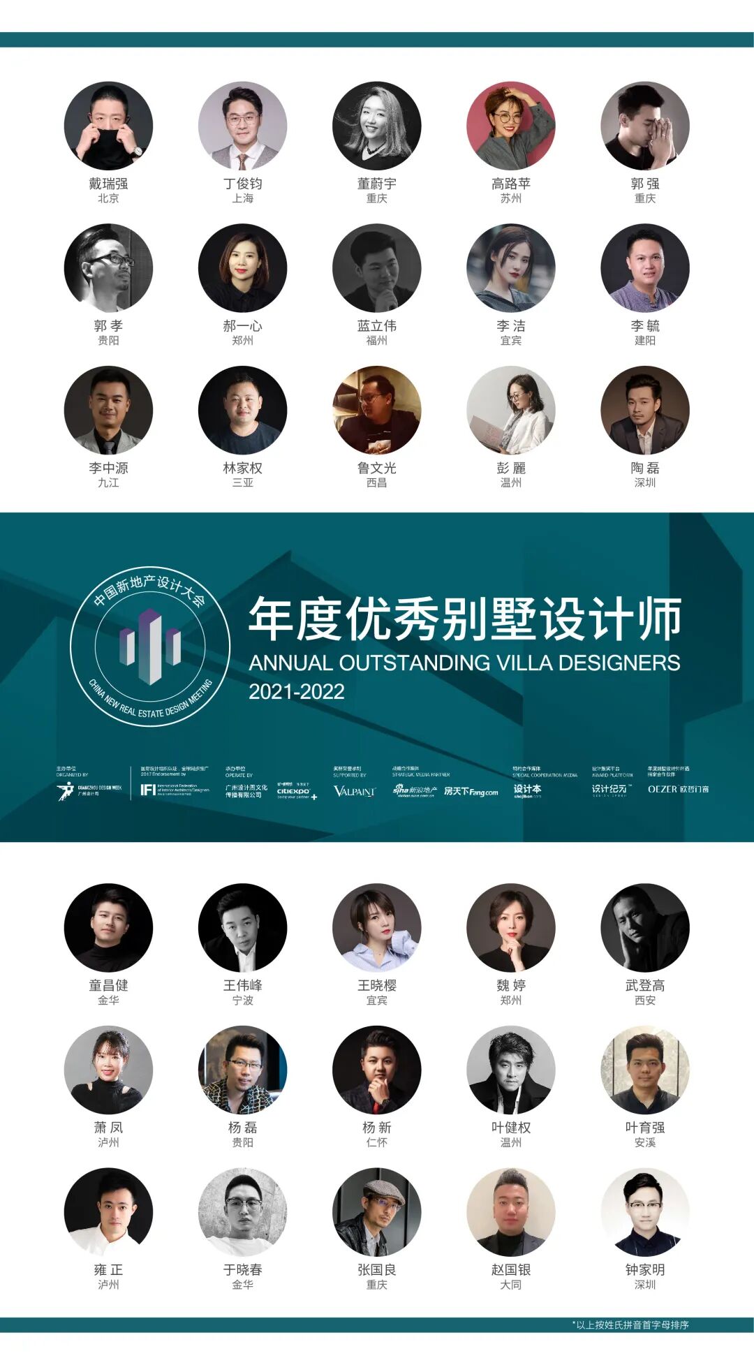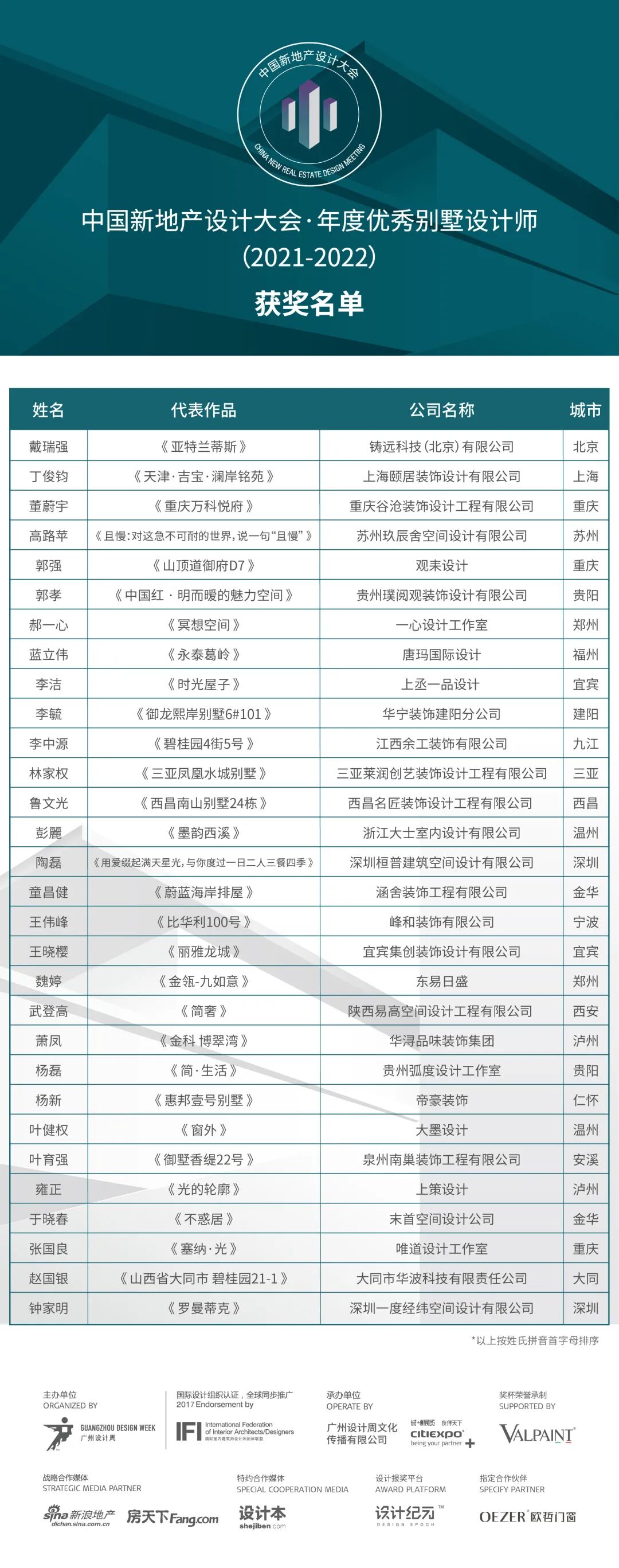2021中国新地产设计大会·年度别墅设计师评选,盘点优秀地产作品,发掘优秀设计新星。用全新的设计语言诠释空间的感受,为别墅的塑造添砖加瓦。祝贺以上获得“年度优秀别墅设计师”的设计师们!