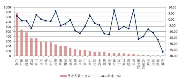 与上年相比,7个地区的从业人数增加,其中,江苏增加人数超过25万人,湖北、广东增加人数超过10万人;24个地区的从业人数减少,其中,四川减少28.76万人、云南减少15.54万人、陕西减少13.32万人、重庆减少11.08万人。吉林、北京、湖北从业人数增速排在前三位,分别为7.83%、7.65%和6.82%;西藏从业人数降幅超过25%,青海、黑龙江、内蒙古、天津、贵州、云南、海南等7个地区的从业人数降幅均超过10%(图18)。