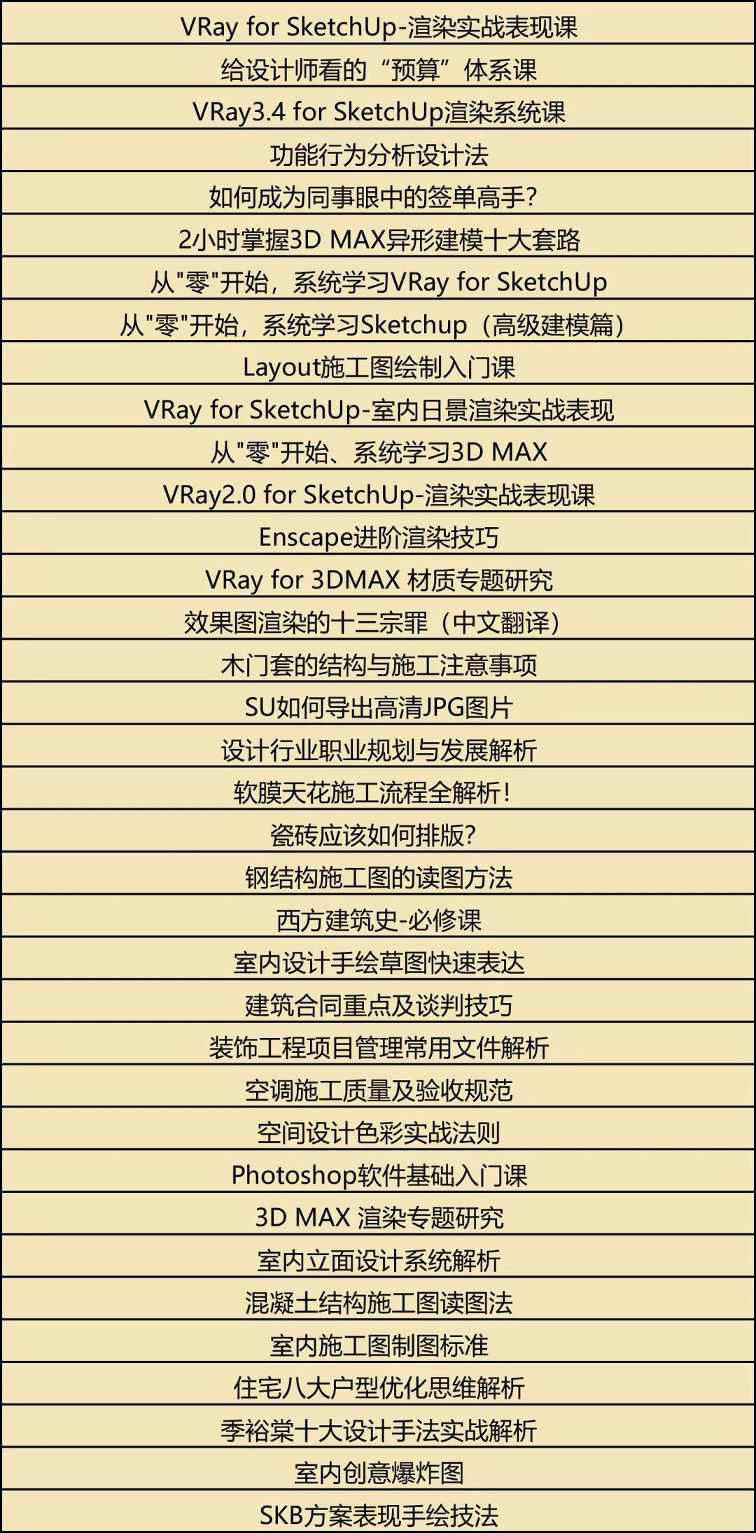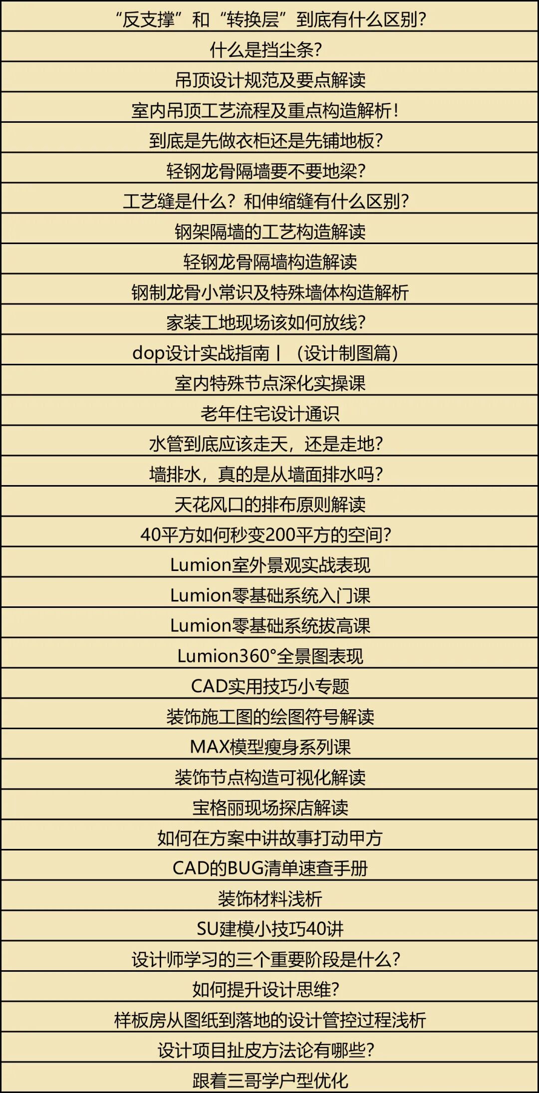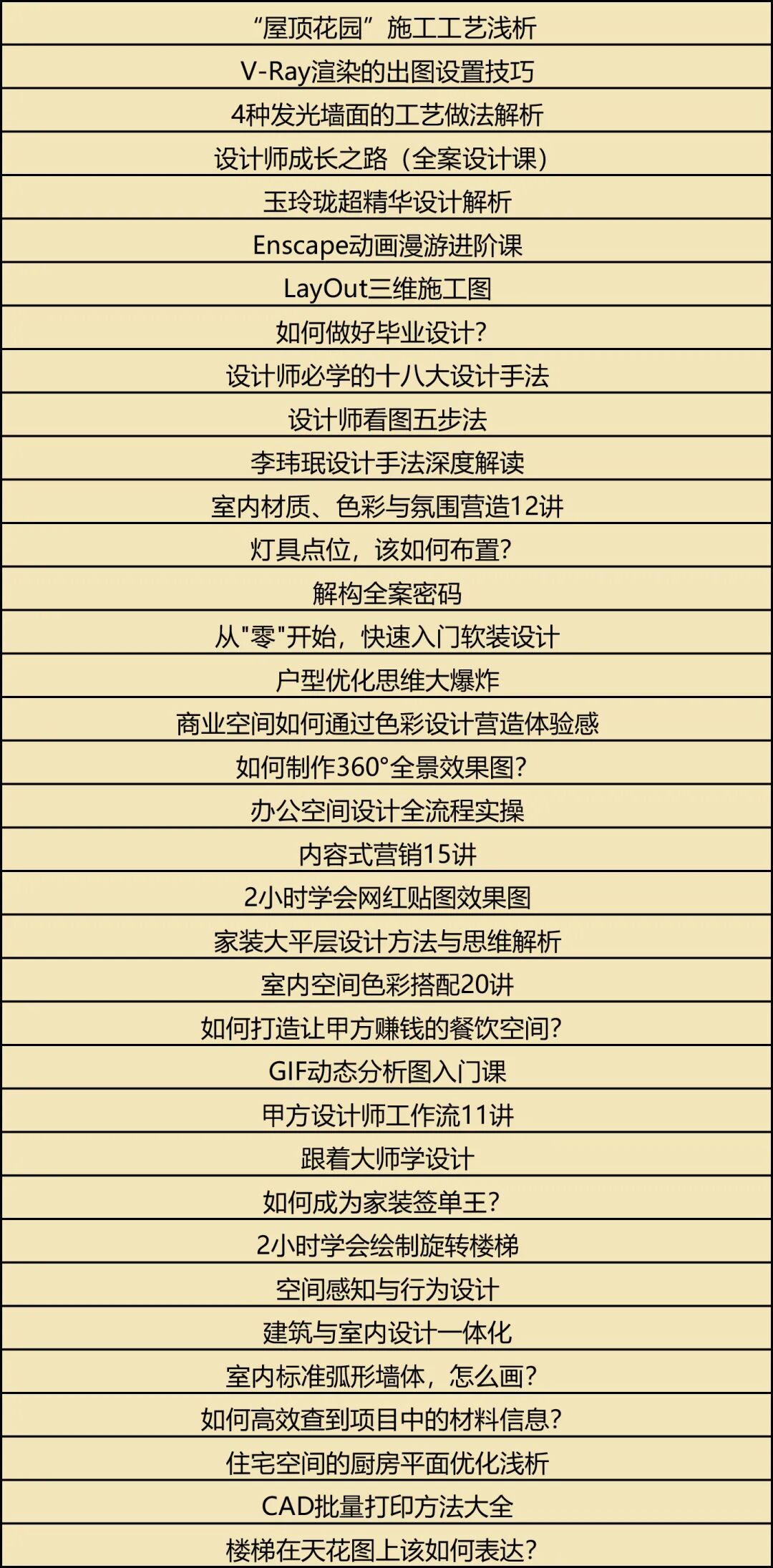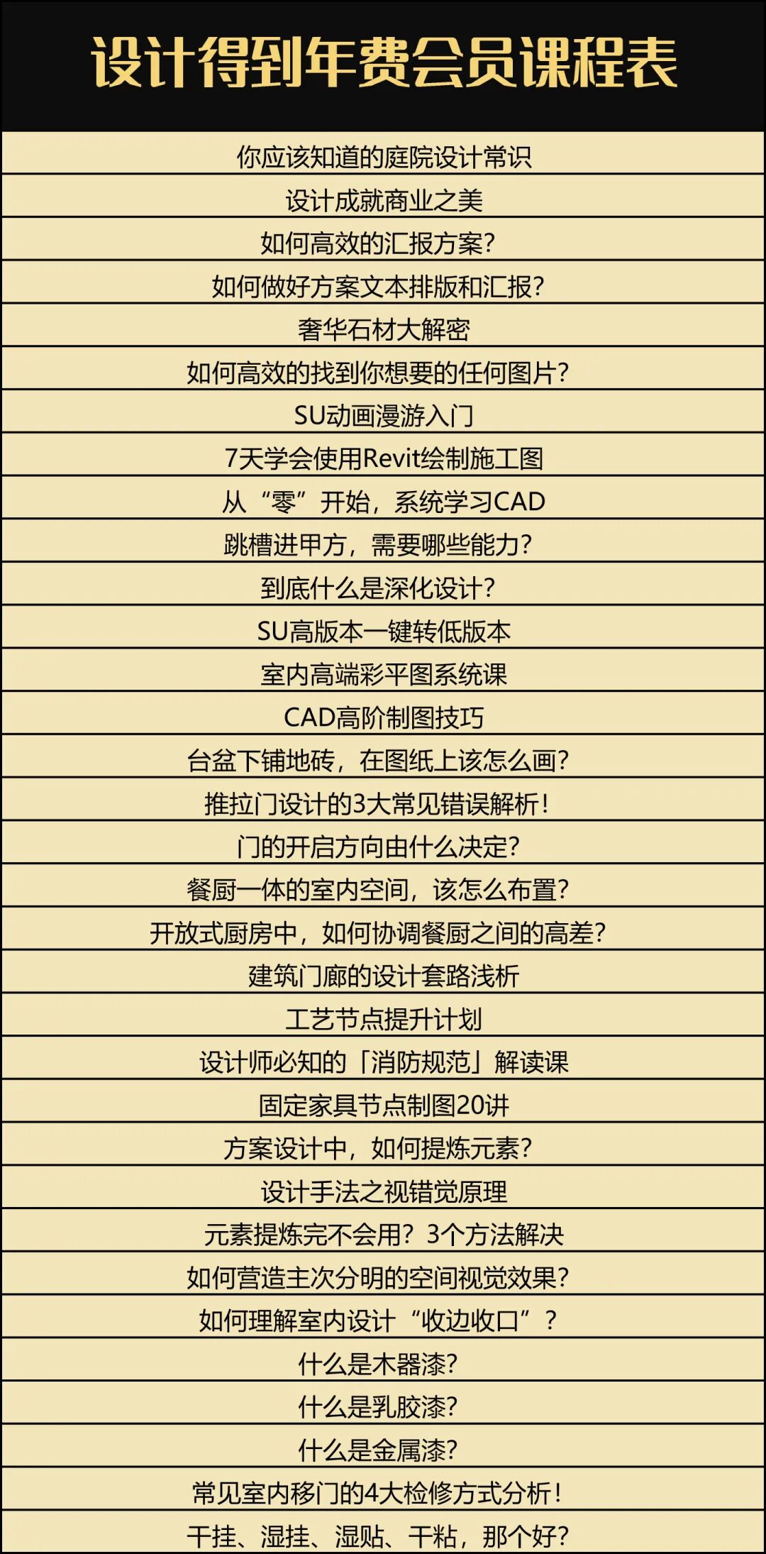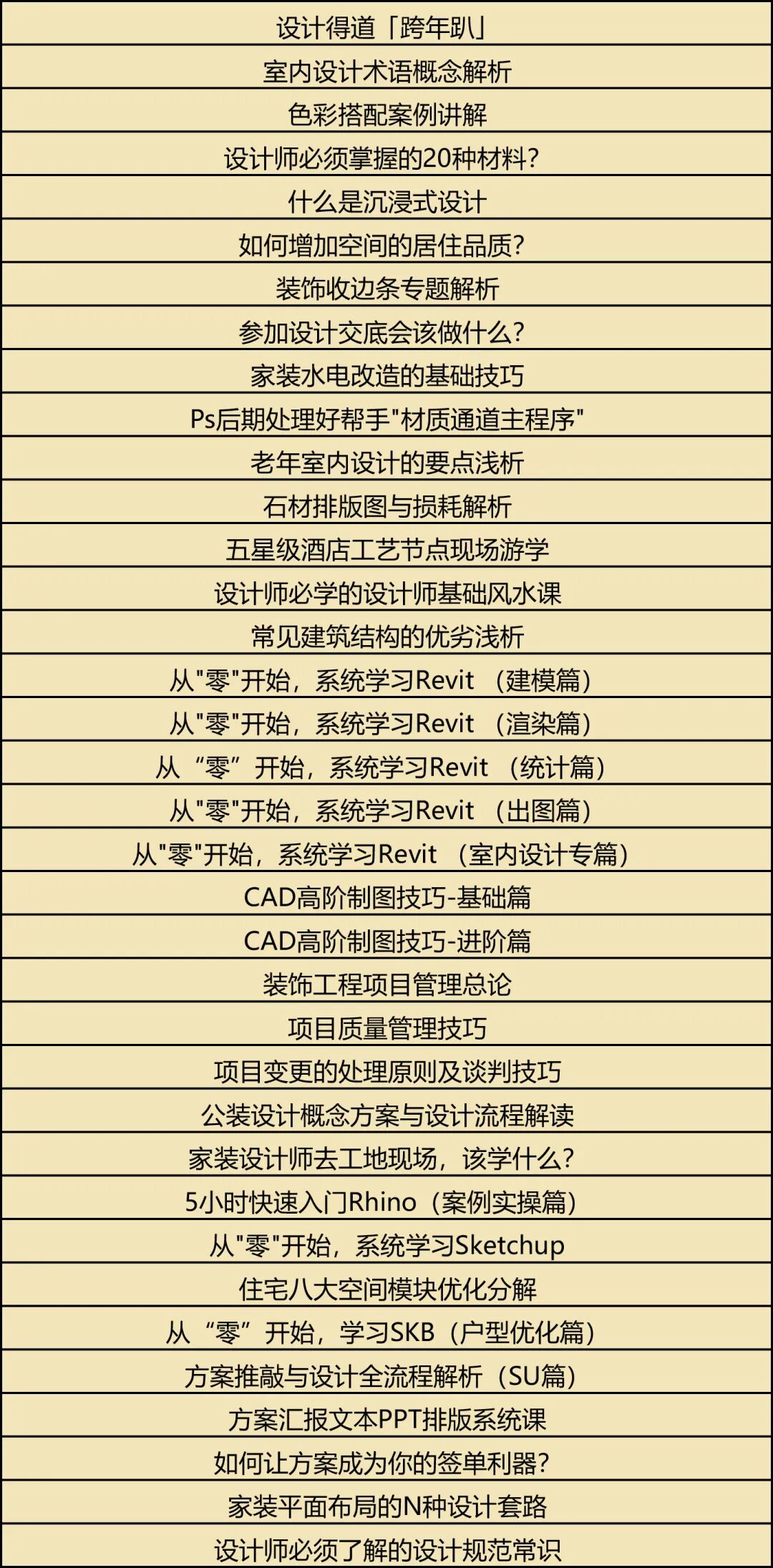 课程涵盖了室内设计行业全领域:材料工艺、制图技巧、方案设计、设计管理等10大专业板块知识点。