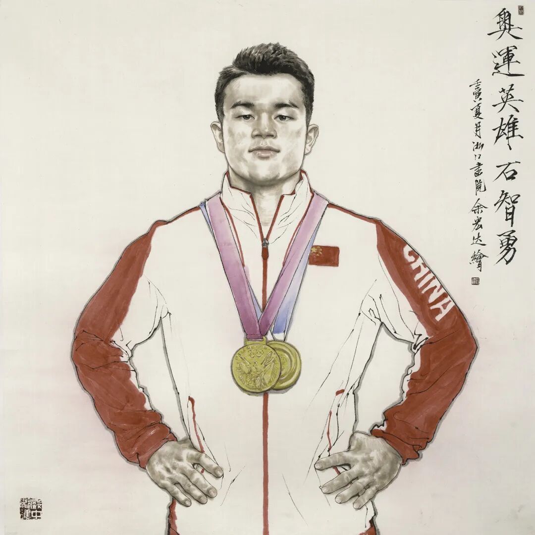 浙江画院人物画工作室主任余宏达从小热爱运动,青睐于篮球、拳击等重竞技,此次为举重奥运冠军石智勇画像深感荣幸。不论是“应物象形”还是“经营位置” ,余宏达在绘画时都思虑周全,以求达到最好的效果。“我考虑肖像画首先要画得像。在比赛当中他的脸,因为是比赛状态,可能会显得夸张一点,不好画,最后选择这个(穿领奖服的)。这次我给他两届奥运会奖牌都挂上去,把它综合一下。最后包括这个站姿,也能体现出他赛场上这种霸气。”