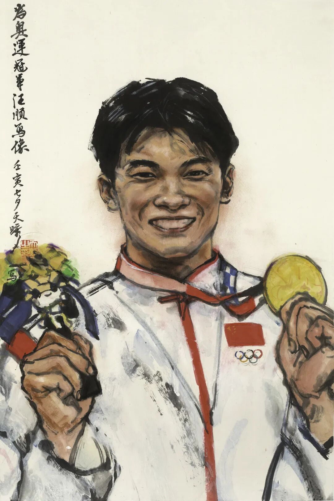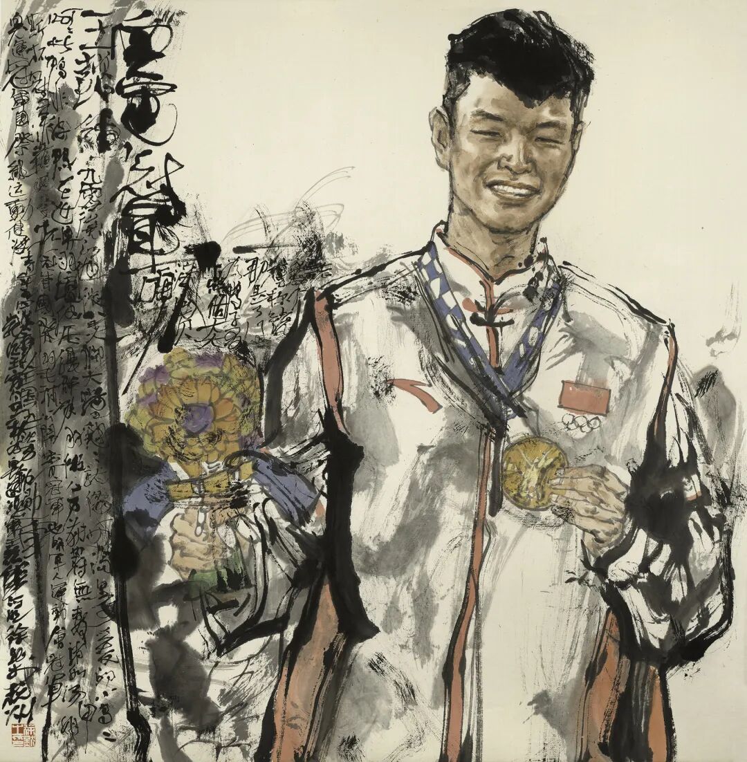 中国美术学院教授、博导徐默为羽毛球世界冠军王懿律画像。在机缘巧合下,碰到了一个朋友认识王懿律的妈妈,也认识了王懿律本人,有了更深入的了解。徐默说,王懿律有个外号叫“鸭子”,“他从小大手大脚,嘴巴有点翘,这是他妈妈说的,很形象。我感觉他就像一个邻家的可爱大男孩……有点憨憨的,有点内向,在刻画他的时候虽然是写意的方式,但尽可能地把运动员在领奖台上喜悦的状态表达出来。”
