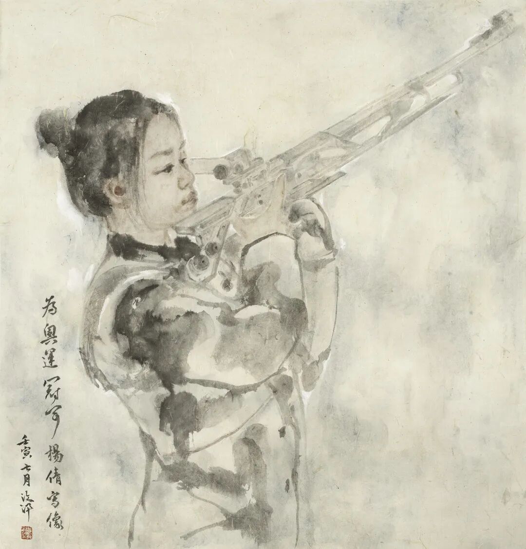 现场,中国美术学院教授、杭州市上城区人大代表潘汶汛作为艺术家代表向射击奥运冠军杨倩赠送肖像画。潘汶汛认为中国画与奥林匹克精神两者都具有真善美、不断突破自我极限的共性。挥纤豪之笔,绘千钧之际;持侠气之枪,夺奥运一金。此次潘汶汛画下的便是杨倩在赛场上,与气步枪物我合一的状态。