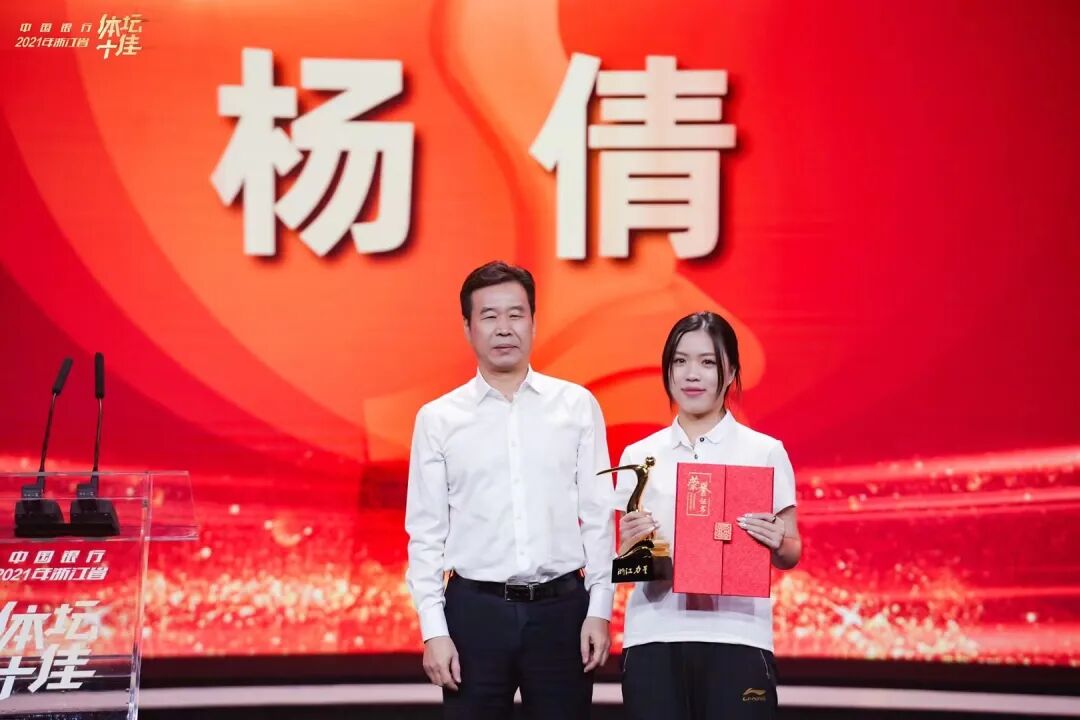 浙江省体育局党组书记、局长郑瑶为射击奥运冠军杨倩颁发最佳女运动员奖