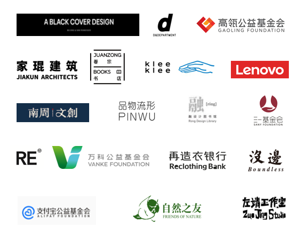 A Black Cover Design、D&Department、高瓴公益基金会、家琨建筑、卷宗书店、klee klee、 联想集团、南周文创、品物流形、融设计图书馆、三一基金会、同更生 ReGeneration、万科公益基金会、再造衣银行、张达工作室、支付宝公益基金会、自然之友、左靖工作室