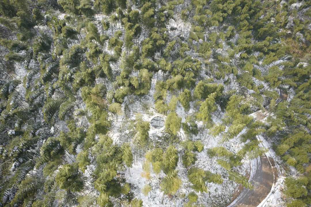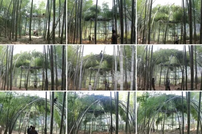 松阳盛产毛竹,徐甜甜观察到山上的毛竹横着都可以生长,有很好的韧性,于是她便采用编竹篮的方法,用生长在周围的毛竹围合出一个像穹顶一样的空间。