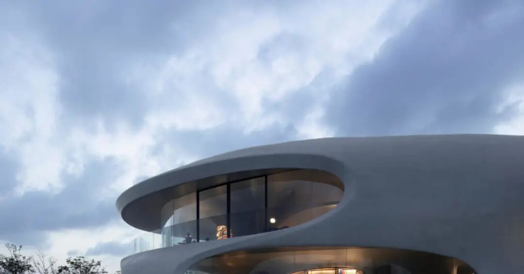 卷曲的混凝土墙体,连接着不同的空间,建筑外围的悬挑设计,则起到了通过物理遮挡降低热辐射的作用,让建筑更加节能。