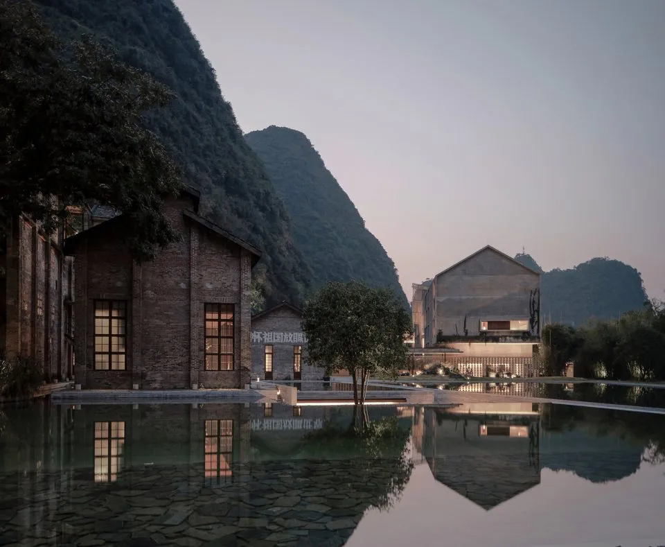 位于阳朔的糖舍酒店,也是一个工业建筑改造的样本。这座受损严重、几近倒塌的老糖厂,寄托了一代人的生活记忆,设计师董功与琚宾,则借助新建筑与室内空间的设计,完成了从建筑到自然,从过去到现代的完美过渡。