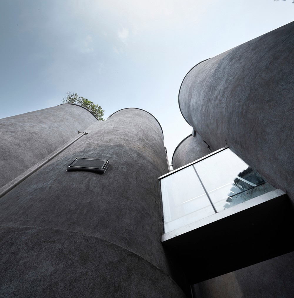 建筑师没有改变筒仓外形,让其保留了原有的工业感,10个筒仓顶部分别种植了一棵桂花树,冲淡了几分寂寥感,显得生机勃勃。