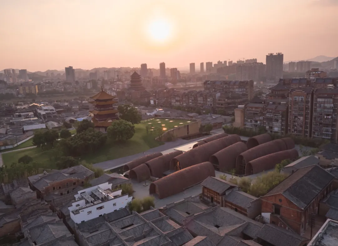 博物馆由八个大小不一、体量各异的线状砖拱形结构组成,造型上采用了窑厂代表性的拱顶,材料使用上则将回收的窑砖和新砖混合。同时还融入了大量传统的建造智慧,比如在建造过程中不用脚手架,而利用砖的收分错位,借助重力完成。