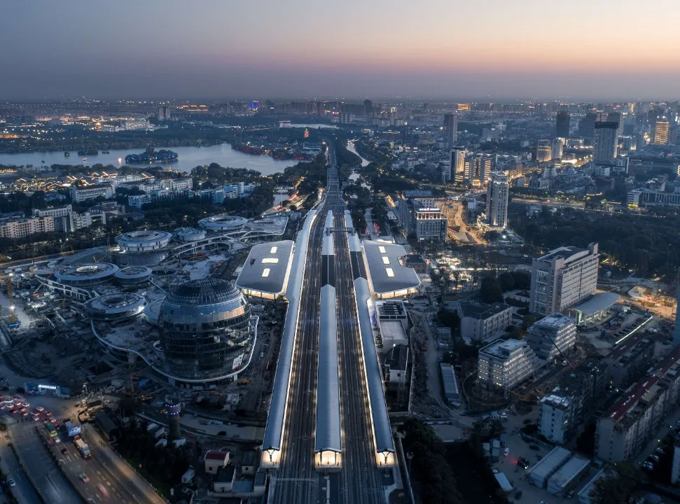 落成不久的全新的嘉兴火车站,是由知名建筑设计师马岩松设计的新地标建筑。火车站采用玻璃幕墙,线条流畅,被誉为最美的“森林中的火车站”,马岩松说:“我想,城市中的火车站有没有可能不追求宏大的纪念性,而是具有优美的环境,舒适宜人的尺度,成为让人们愿意停留、放松的城市公共空间?”