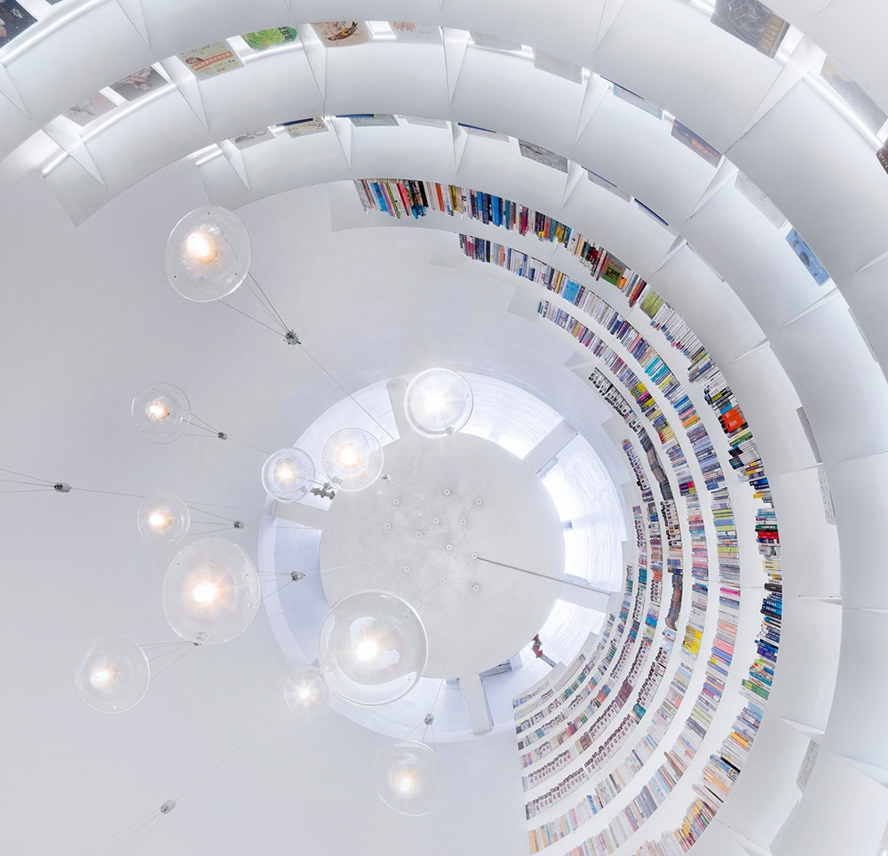 内部则被设计师改造成三层的“书仓”,读者可以顺着筒仓楼梯去往楼顶,在十个水泥筒间自由穿梭。