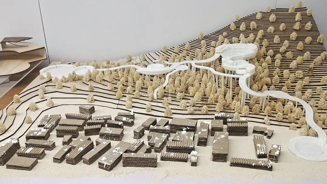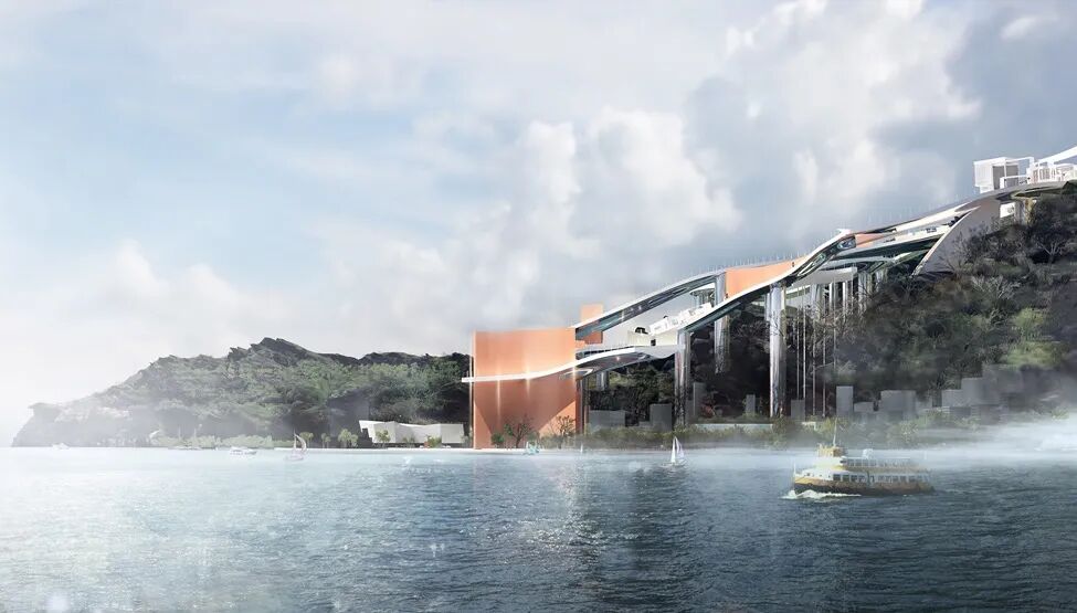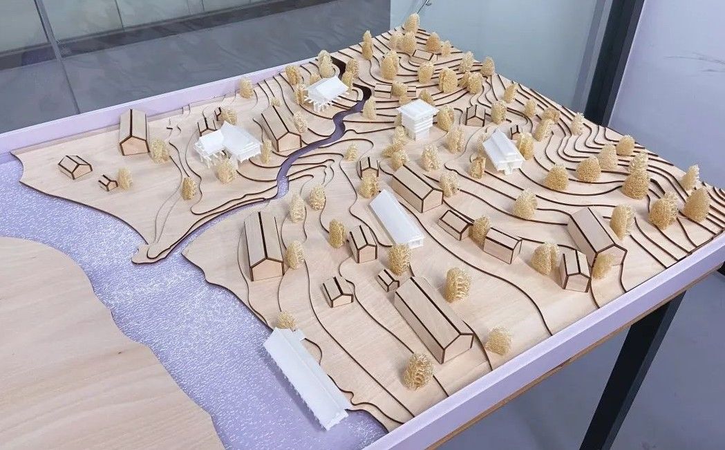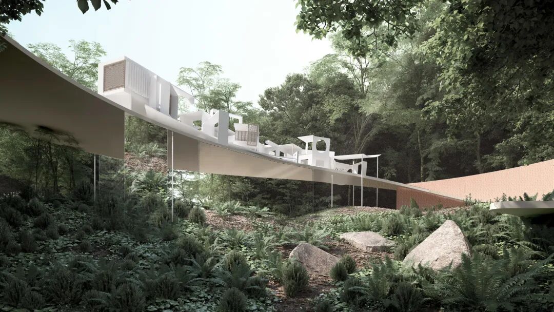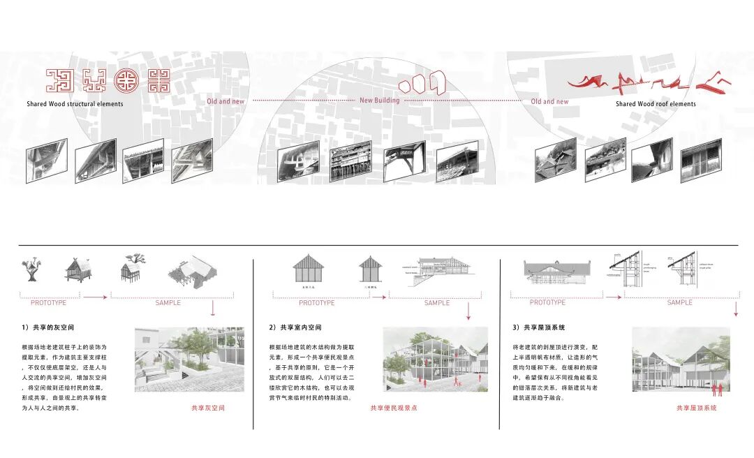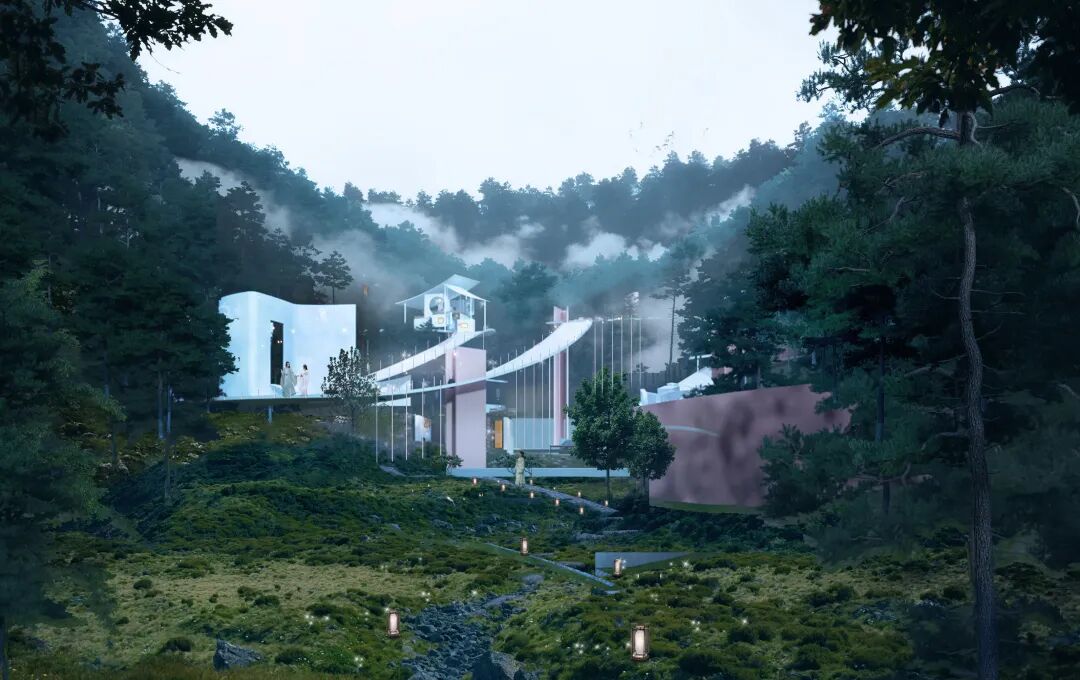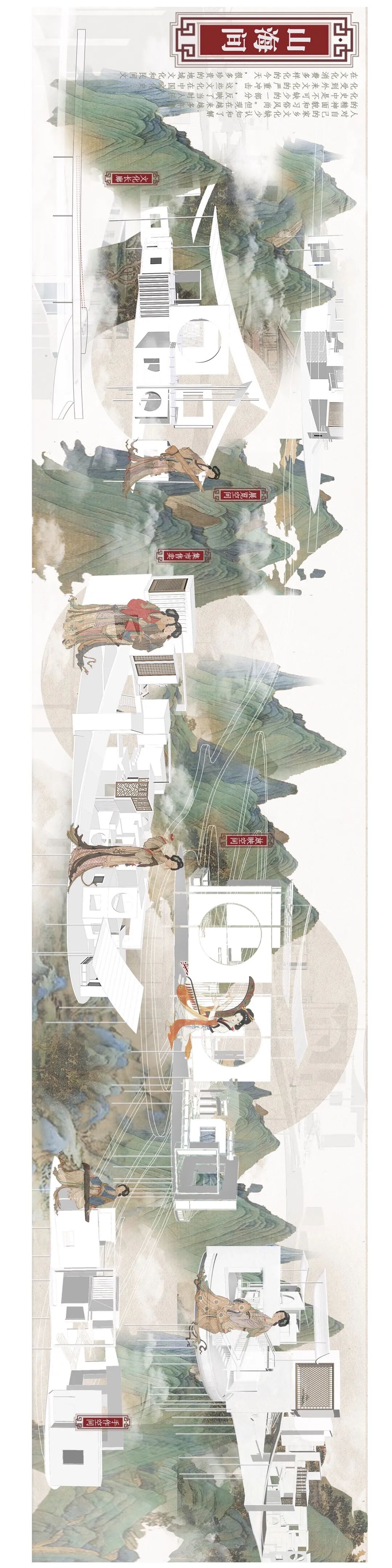 设计说明:此次设计的目的是规划出最能展现舟山岛屿上富有当地海洋文化的建筑形式。通过京剧《妈祖》的多幕场景演绎,将古村落遗迹、山地景观和新造建筑三者关系叠加,使游客可以通过建筑进入村落并感受历史的痕迹和海洋文化。设计出的文化建筑和原有村落有联系并有互动感,利用当下的价值方式和审美,保留民间文化的独特。