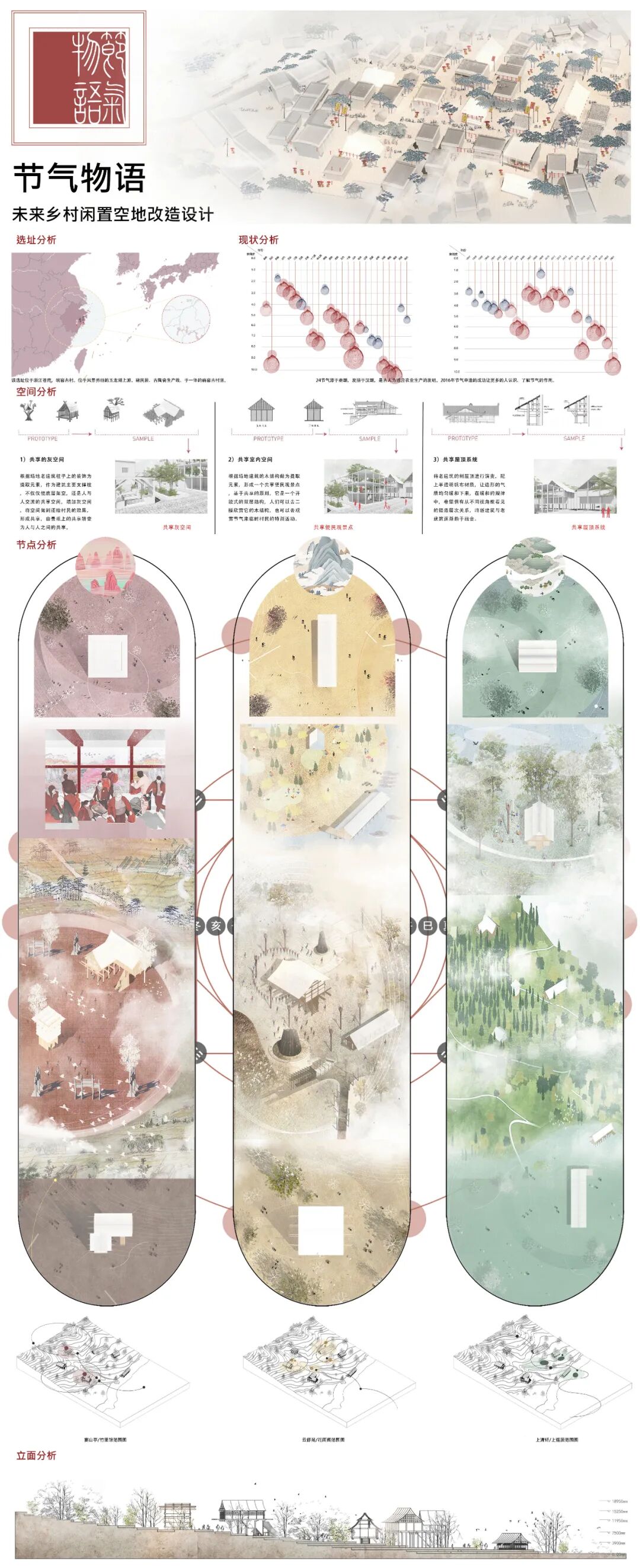 设计说明:通过对当前和历史问题的分析,以及通过阅读各种文献关于对新型乡村发展的愿景和启发,本次设计提出了一种新式的乡村模式。打造一个以再生乡村文化,唤醒乡村文化为主题的新型乡村文化综合体。在闲置空地的改造设计中,将村落中所需的不同功能分类置入到乡村中,将村民所需的功能合理的进行排列布置。二十四节气不仅是传统文化,更是一种延续文化的精神,填补乡村文化缺失,为乡村闲置地再利用提供了一种新的可能。