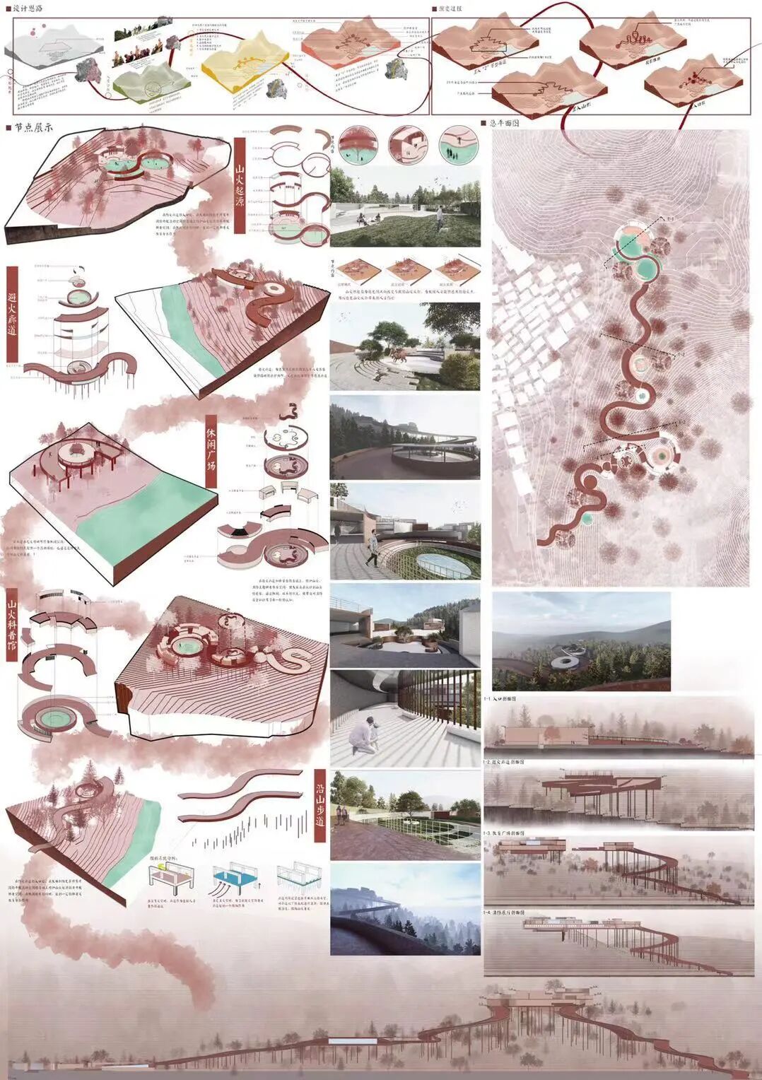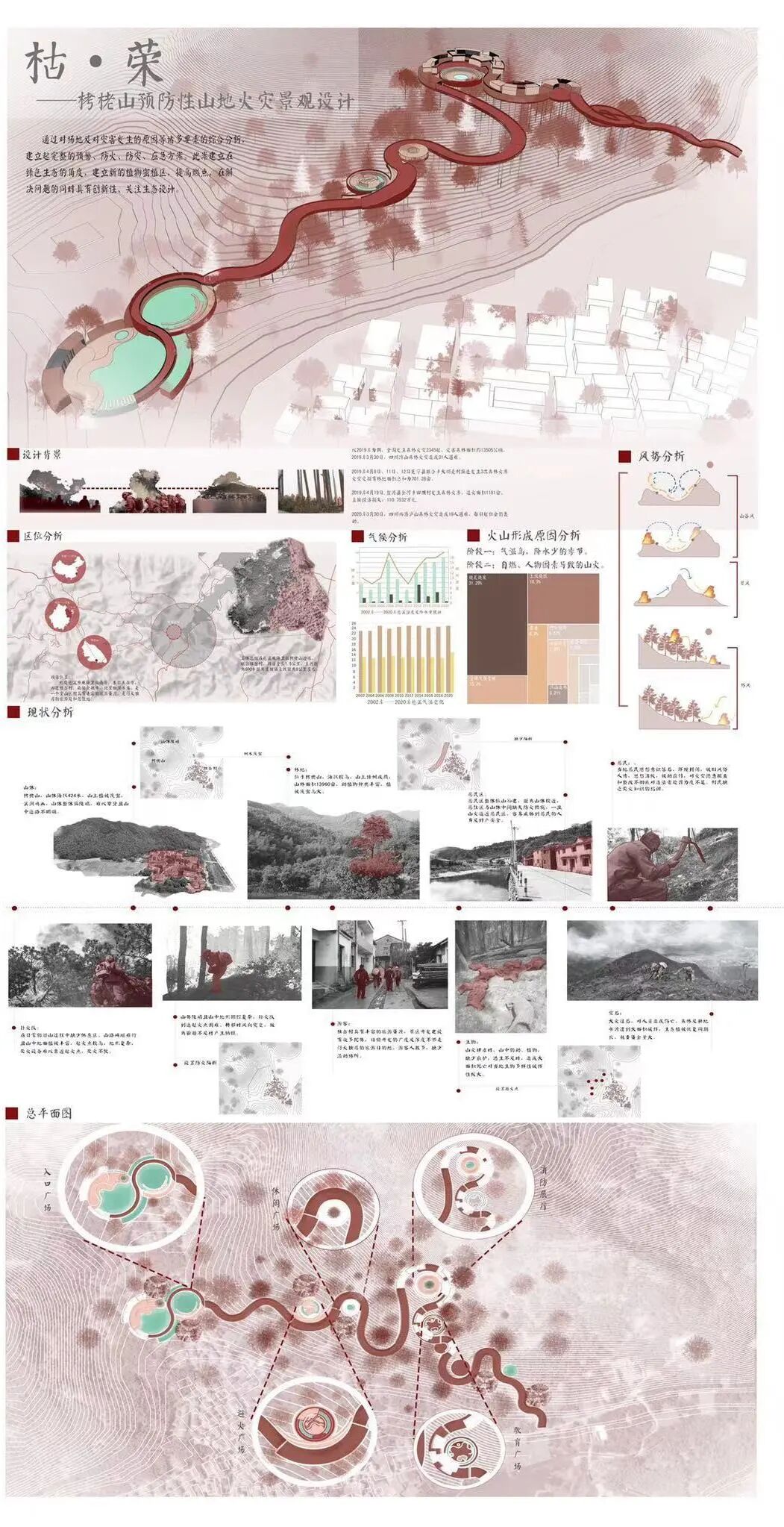 设计说明:通过对场地及对灾害发生的原因等诸多要素的综合分析,建立起完整的预警、防火、防灾、应急方案。此案建立在绿色生态的角度,建立新的植物密植区,提高燃点,在解决问题的同时具有创新性、关注生态设计。