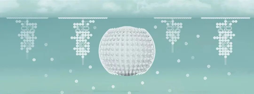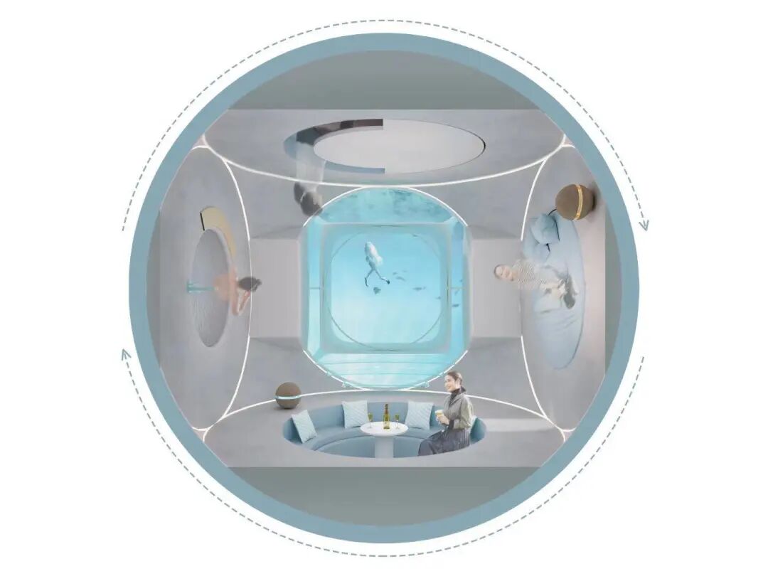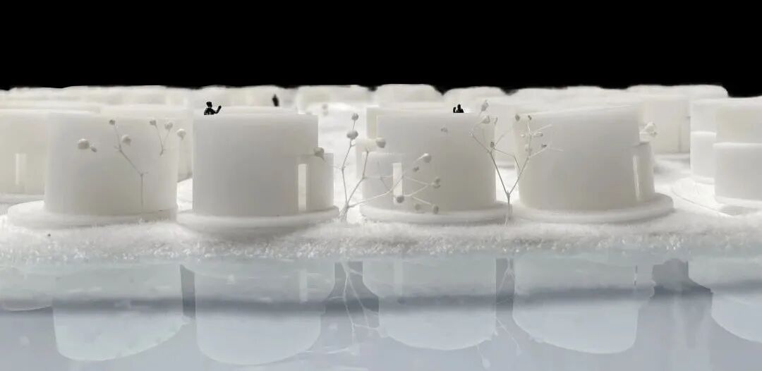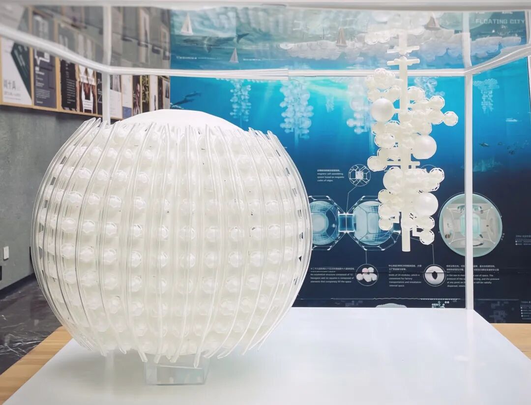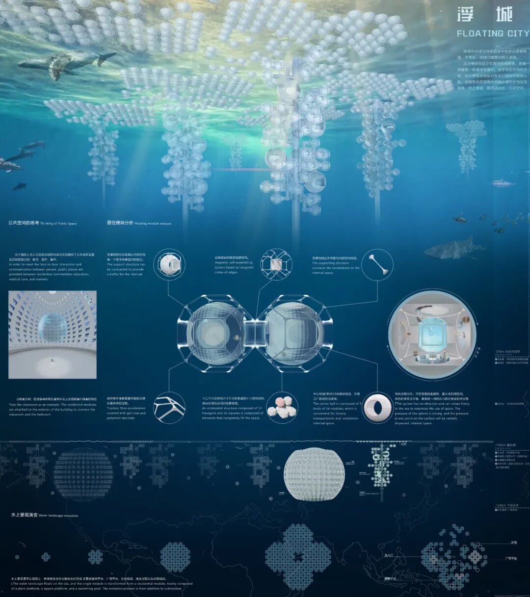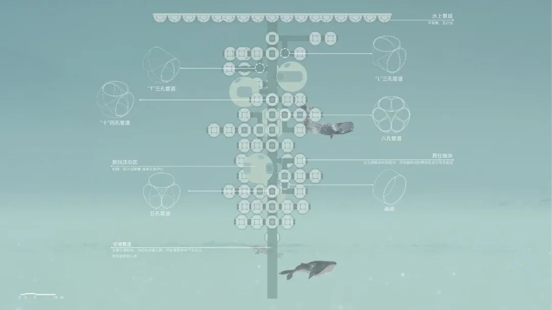 设计说明:地球在40多亿年的历史中曾多次进入冰河时期,千年后,地球可能再次陷入冰期。本次设计的主要目的是在冰期来临时,人们能采用模块化设计在海洋中形成群落,由于可生存面积不够,所以整体采用纵向生长以增加可容纳的人数,就像一串葡萄漂浮在海中。