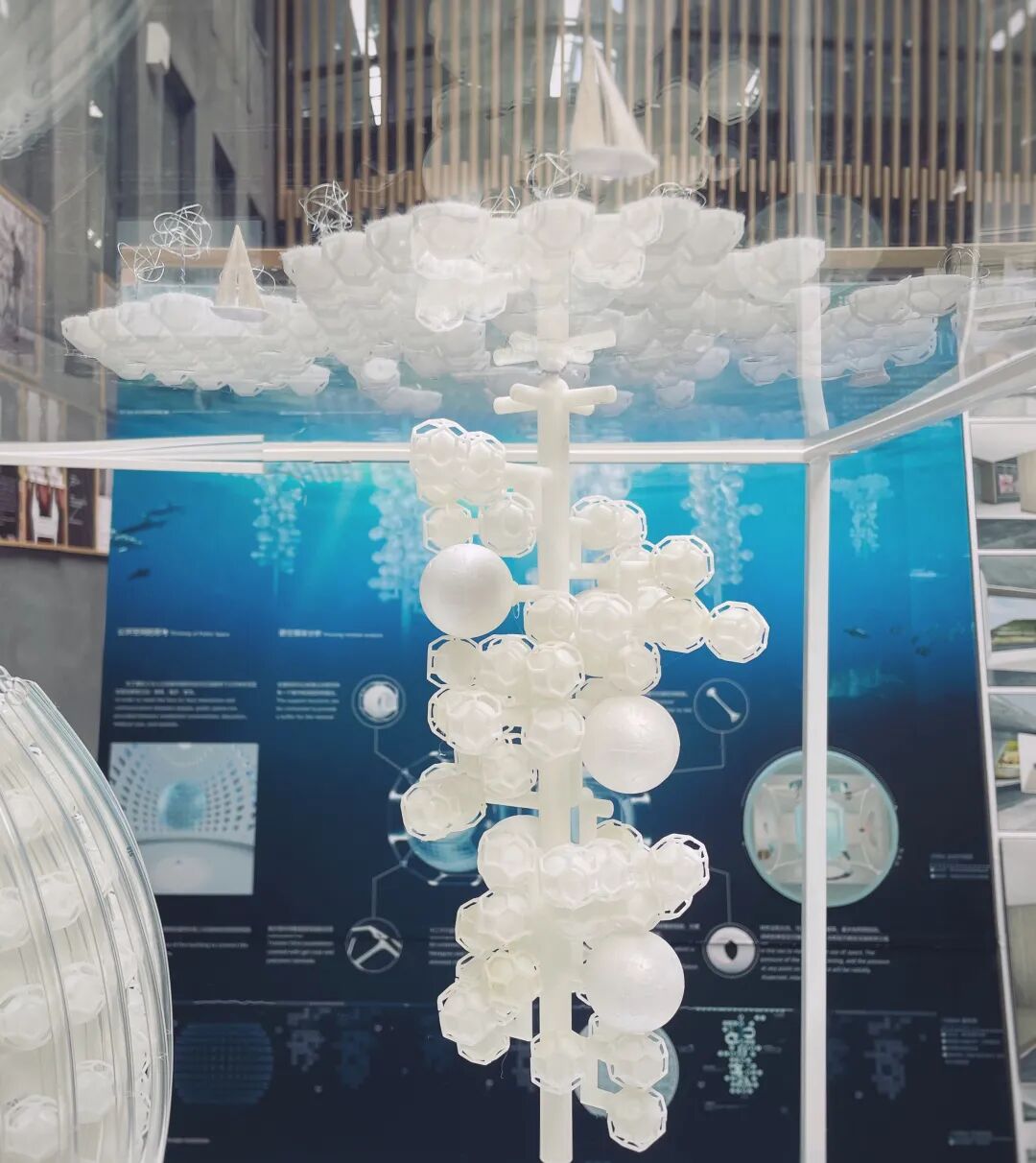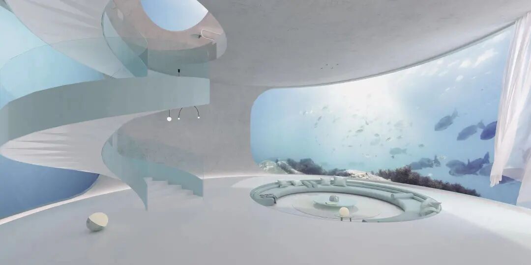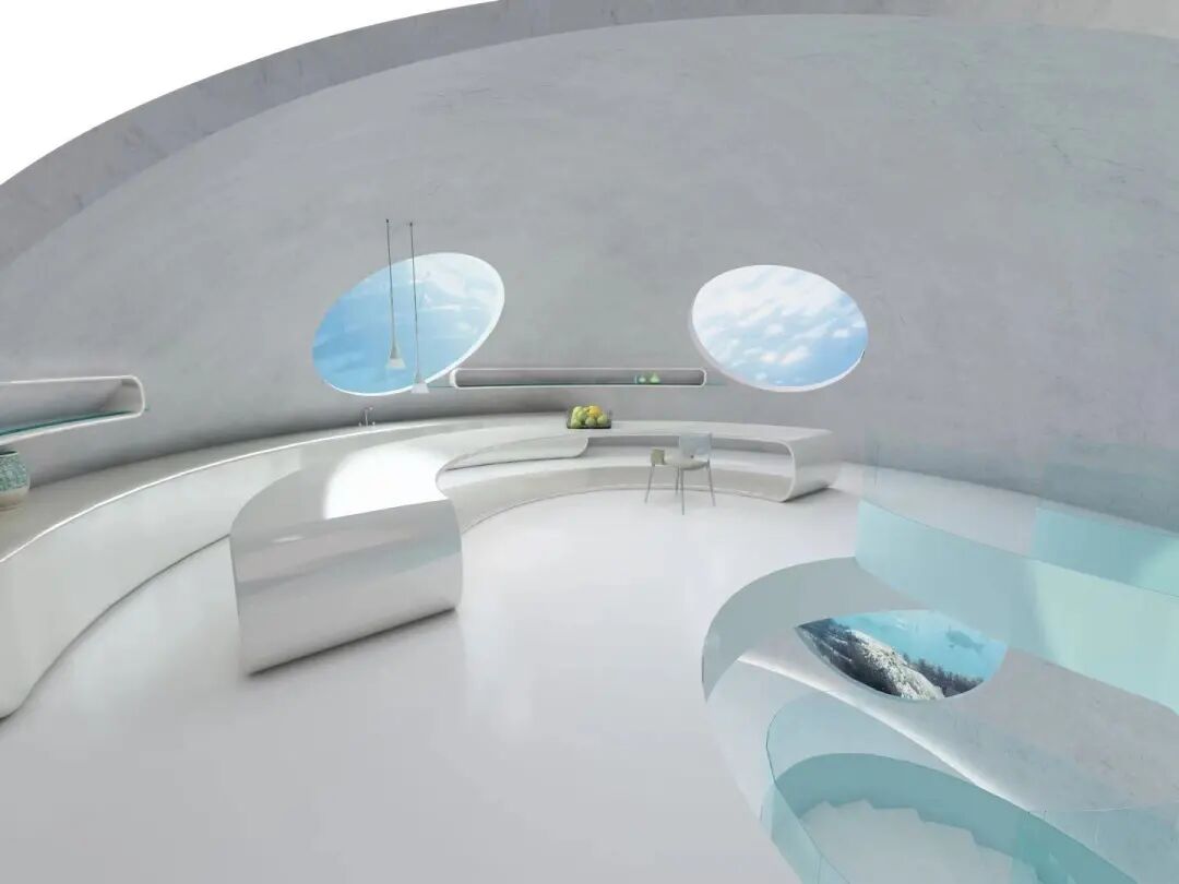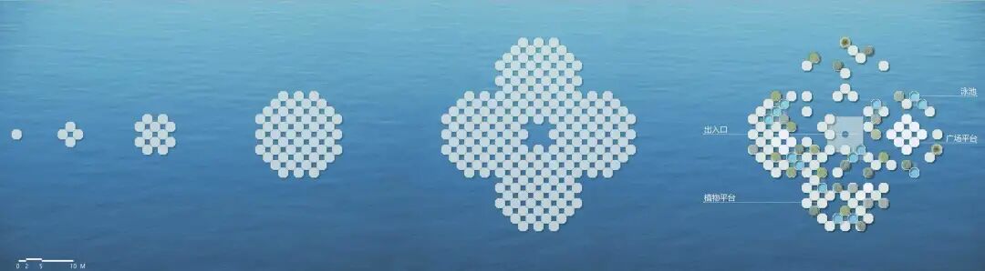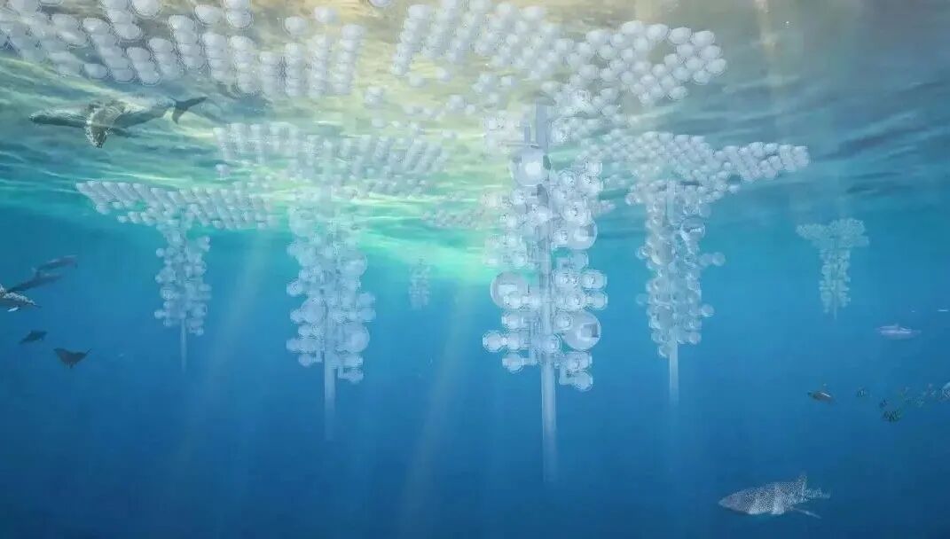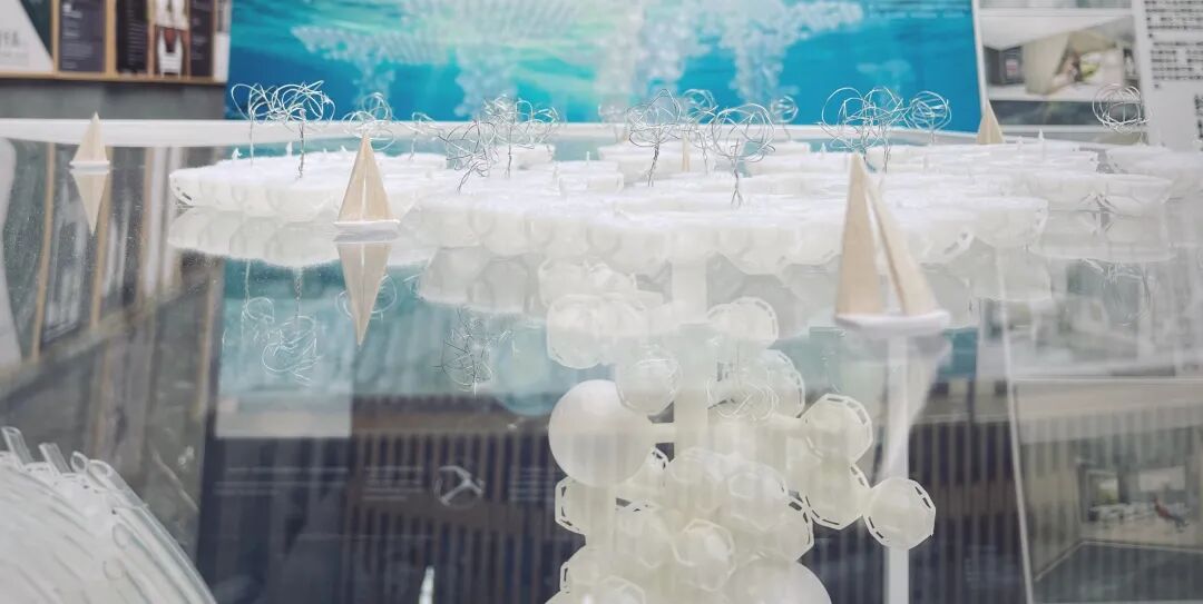 设计说明:地球在40多亿年的历史中曾多次进入冰河时期,千年后,地球可能再次陷入冰期。本次设计的主要目的是在冰期来临时,人们能采用模块化设计在海洋中形成群落,由于可生存面积不够,所以整体采用纵向生长以增加可容纳的人数,就像一串葡萄漂浮在海中。