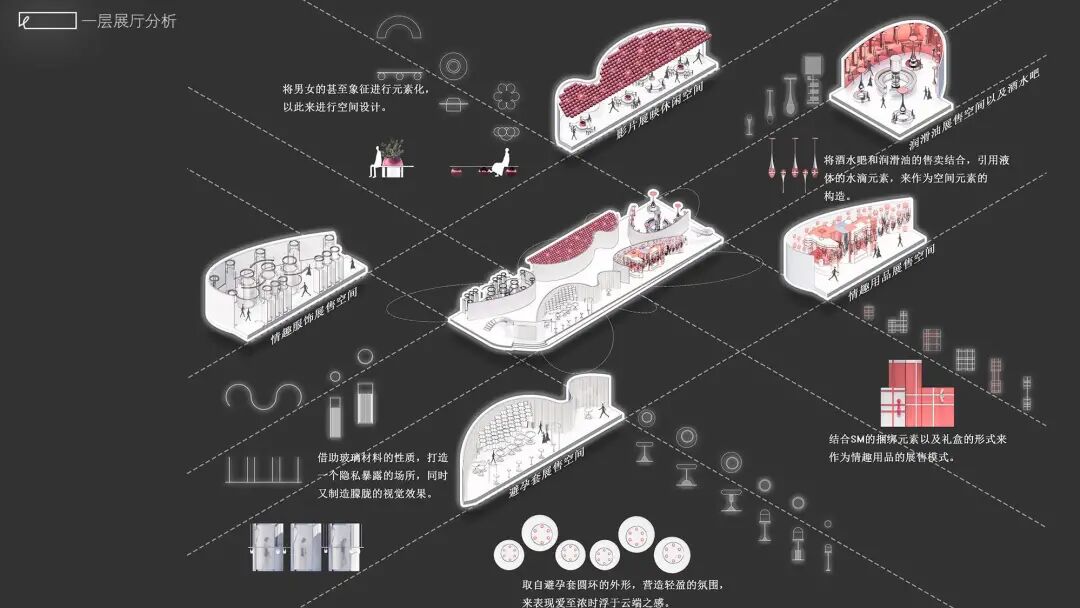设计说明:本次设计的是关于性主题空间的先锋实验性设计,旨在通过对成人用品店的实验性设计, 创造一个有别于传统成人用品店的建筑空间设计,提取“性”元素并合理合适应用到建筑空间中,分析全新的商店空间模式,探讨空间与人的互动模式,让人们能够更加正确开放地看待成人用品店以及有关“性”的话题。