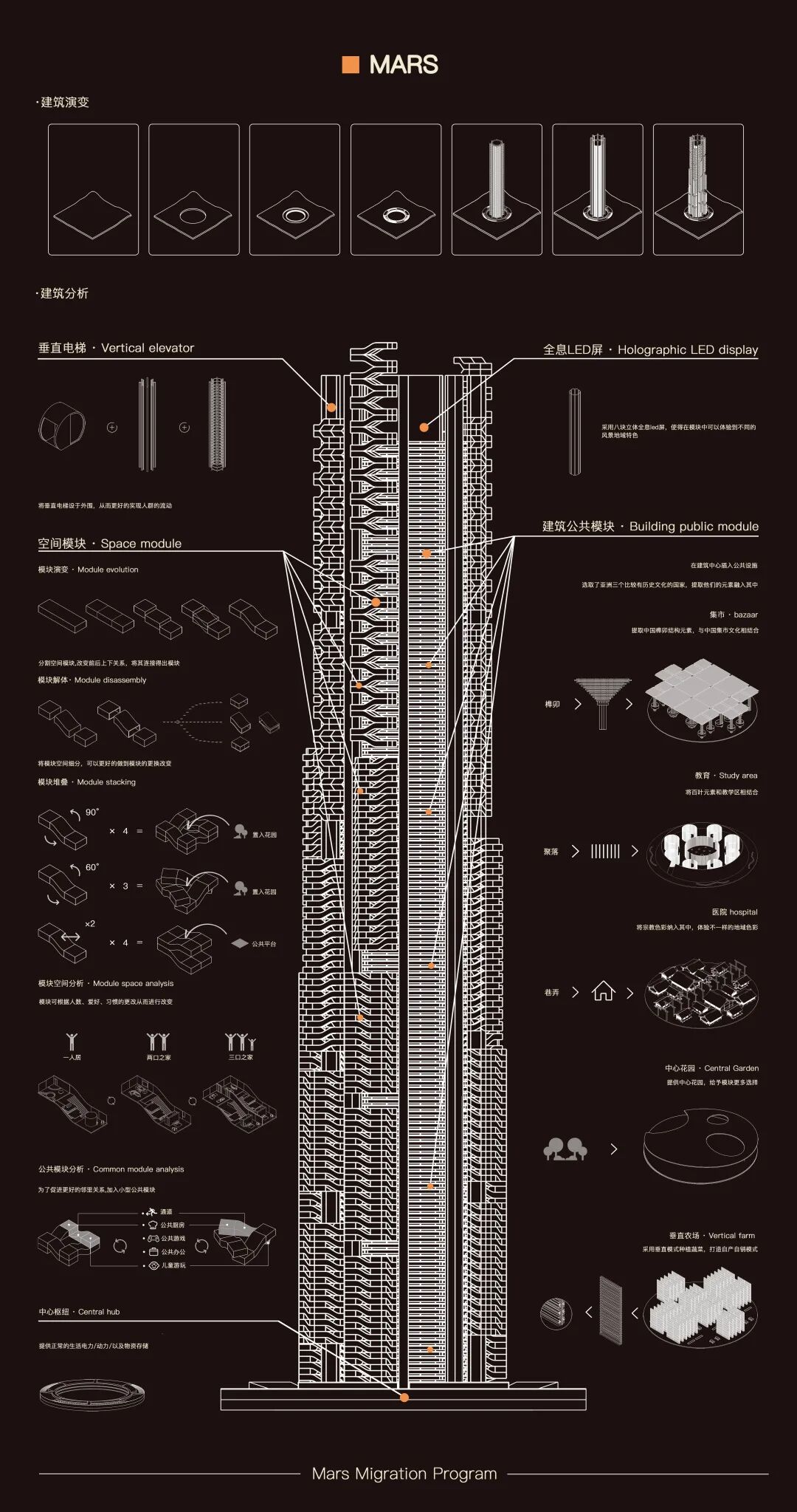 设计说明:针对地球上错误的城市规划问题所导致的不可逆的破坏,提出更理想化,更具前瞻性的火星移民计划。通过改变城市规划模式,形成永续发展的建筑居住模式,减少对已有土地的破坏,使人、环境和建筑更加和谐共处。希望通过对人类更理想、更合理的生存空间的可能性的假设,让大家思考人是什么、如何生存、地球该如何继续发展。