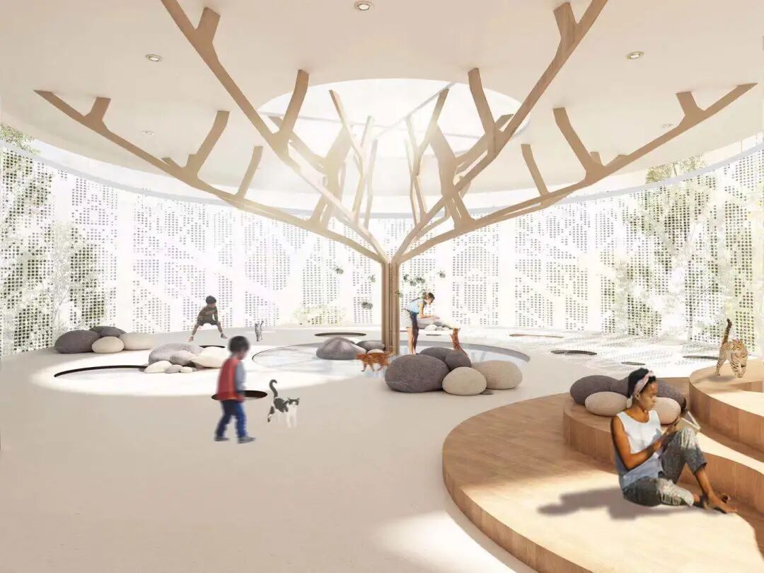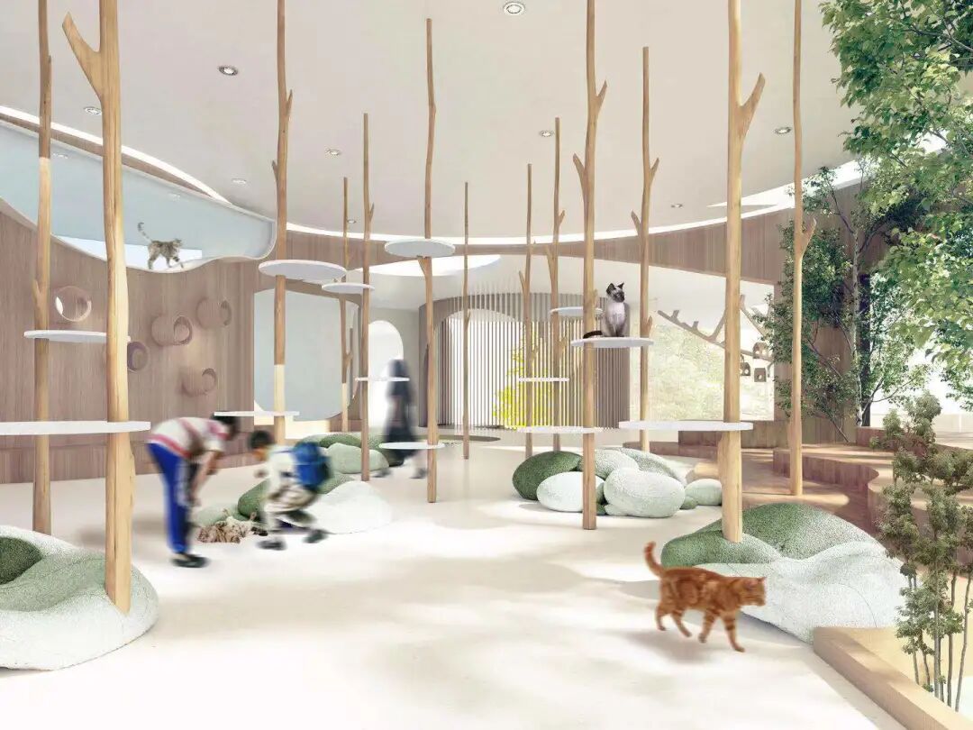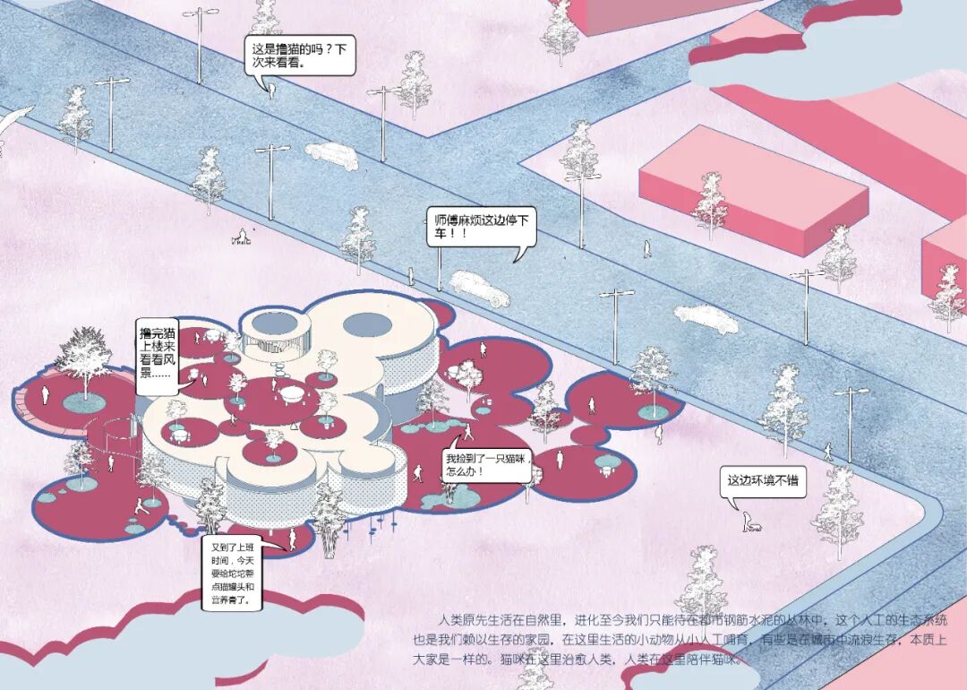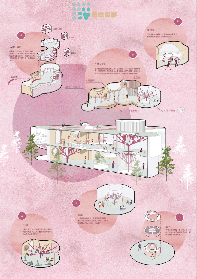 设计说明:本设计旨在为可回归家庭生活及需要救助的流浪猫打造一个临时租屋,将猫的寄养、美容、社会化和人的社交生活相结合,为猫提供一处暂时的居所,并帮助它们找到属于自己的家。猫咪在这里治愈人类,人类在这里陪伴猫咪。