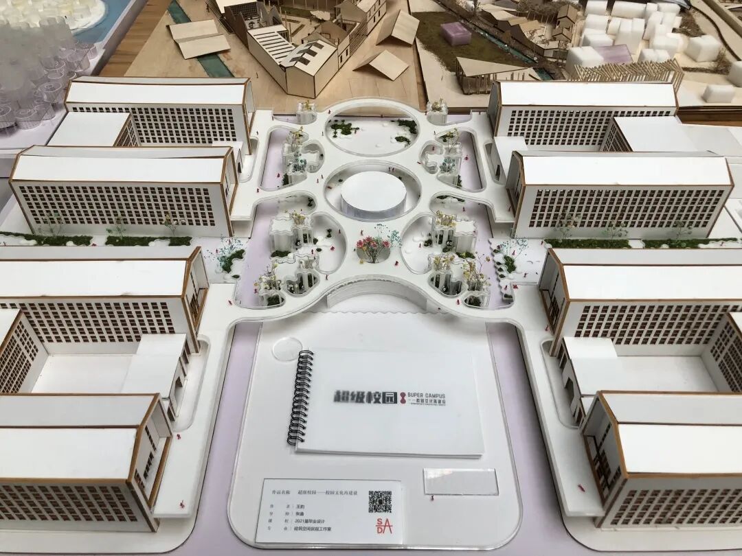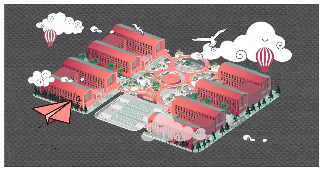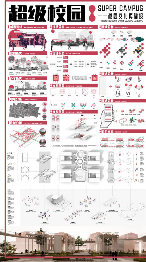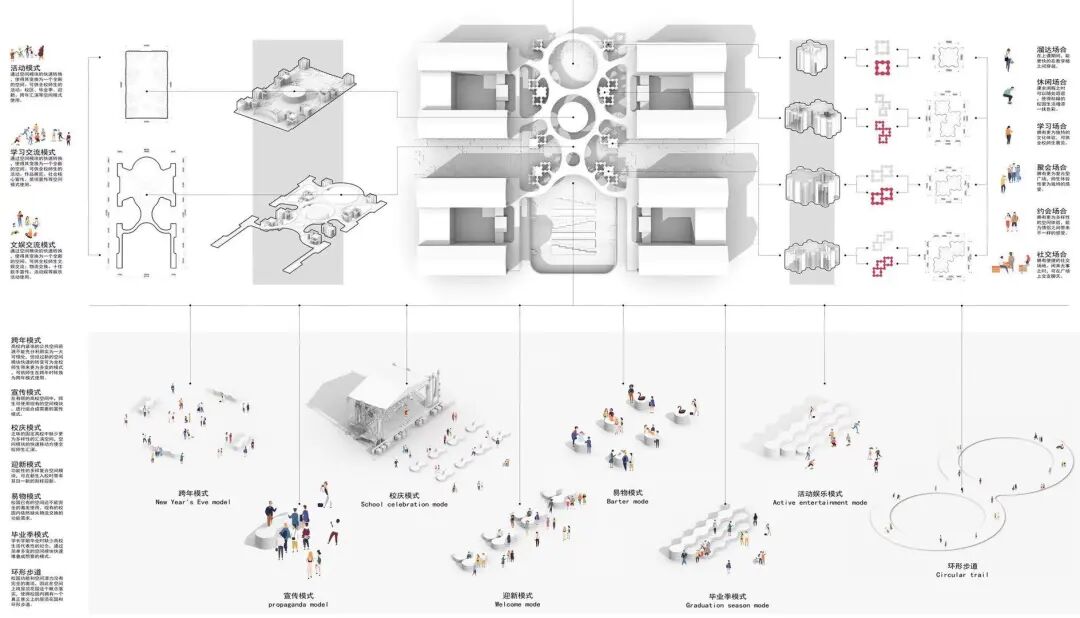 设计说明:由于校园场地限制,全校师生都有着空间资源紧张困扰。为了提升空间的体验感,本设计在有限的广场空间中采用渗透性的街区模式,并在广场空间的使用上提出分时共享的模式,以提高空间利用率。在广场空间的设计上选用固定模块、连接点、非固定模块的多样化模式组合,构成超级复合功能的超级校园。