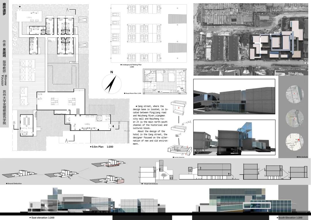 设计基地所在的仓街,位于平江路与内城河、相门城墙、外城河之间,是历史文化街区的南北主要通道。基地位于仓街南段道路东侧,内为保护规划划定的改建建筑;基地外围则为建设中的新建商业群体。
