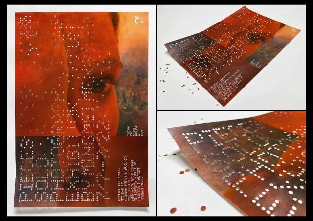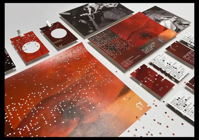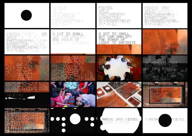 作品說明 Description:“碎”是纽约摄影师孟明美的个展主题。她花了一年时间与六十几位艺术家一同工作并拍摄,然后把这些“碎片”集合起来在纽约艺术中心画廊展出。我们在设计这次展览的视觉形象时,在保证核心信息可识别的前提下,将主题信息字体进行碎片化处理,以切合展览的主题。海报和其他推广物料,包括胸牌、信息卡、明信片等,都进行了穿孔处理,以传递出展览“碎”的主题。