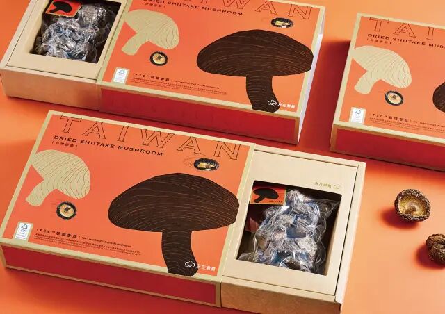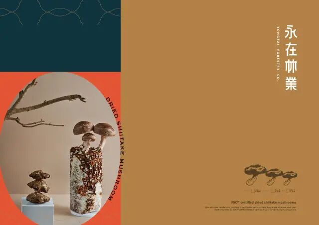 作品說明 Description:永在林業早期以傳統林業為為基礎,近年隨著環保意識抬頭,永在林業成為首間通過FSC(森林管理委員會)認證的廠商,以友善環境的種植方式,兼顧產業、生態環境及社區的永續發展。過去,業者引進外來種「銀合歡」作為生產紙漿的原料,然因經濟價值不如預期而遭到棄種,銀合歡侵佔了原生種的生存空間,為此永在林業投入計畫性造林,逐步移除銀合歡,並將銀合歡與其他樹種製成木屑太空包,供應給台中新社的菇農種植香菇,取代原本品質不穩定且來源有疑慮的太空包,首創具有FSC認證的環境友善太空包,大大改善了香菇生產的品質及可控性。此外,永在林業與奧丁丁市集合作,可溯源的區塊鏈銷售模式,讓消費者可以購買產銷履歷清楚又安心的香菇禮盒。 設計方面,優化永在林業原有的logo中文字體,以粗細均等的黑體為基礎,象徵林業永續發展的穩健及木材的溫暖質地。禮盒正上方斗大的「TAIWAN」字樣強調了香菇的生產地,正面以香菇剪影打上木頭紋路,從觸感受由FSC認證木材栽種出來的天然好菇。禮盒側面,香菇的俯視圖轉化成重複交疊的幾何圖騰,彷彿一朵朵碩大的香菇正從太空包冒出,橘底搭配金色邊框,散發高品質的質感。