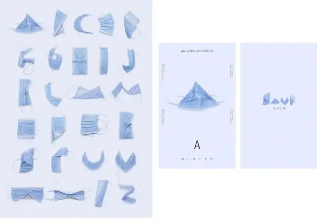 作品說明 Description:2020年初春降至之时,新型冠状病毒于中国湖北省武汉市蔓延开来。这一年是被新冠病毒的恐惧的一年,而口罩则是这场战役里的防护膜,它不但减缓了病毒传播,而且减轻了人们的恐惧。渐渐地,群策群力下,国内的疫情状况已相对平缓,只在部分地区偶有反弹。疫情刚爆发时,许多人并不知道这是一场灾难,大部分与网络社会脱节的中老年对戴口罩这一行为从反感再到意识到口罩的重要性。疫情爆发至今已经一年多了,仍然有许多反智者反对戴口罩,导致世界的疫情不断蔓延、反弹。在新冠疫情爆发后口罩成为了我们每天出行必不可少的物品。我们通过对日常生活中的口罩形态进行观察,设计制作了这一套用口罩做的字体,这些都是用真实的口罩拍摄、后期,每一个口罩都是力求最自然真实的状态,为了传达口罩给人的熟悉感、日常化。同时宣扬口罩起到的重要作用,它已成为防护疫情中不可或缺的角色。