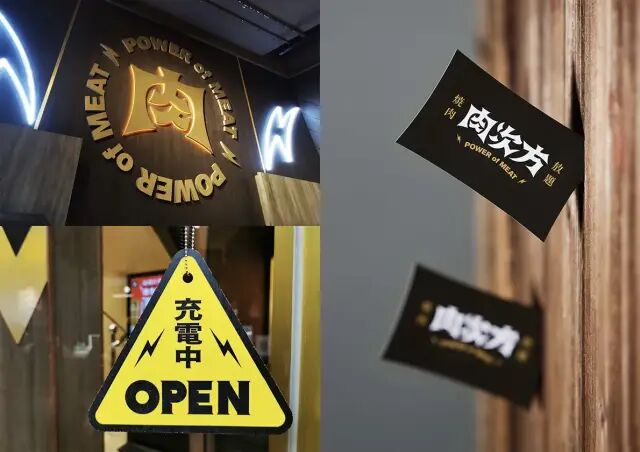 作品說明 Description:肉次方是一家充滿視覺與味覺體驗的日式燒肉店,各式無限供應的肉品與海鮮,滿足每一位無肉不歡的饕客。我們將肉食愛好者被肉滿足,將蛋白質轉化成能量的概念,以「用肉發電」為主軸,象徵能量如電力爆發,以電力符號為商標元素,貫穿商標、空間、菜單、銘牌與食器等延伸物。爆破狀的標準字,有著擴張的視覺張力,更有著電力四射的視覺效果,黑與金的品牌色,呼應精緻的餐點品質與高級的用餐體驗。餐廳空間中,以細膩筆觸刻畫出富有生命力的牛、豬、雞與魷魚,與肉之火山的能量噴發,呈現於無法忽視的滿版牆面,凸顯食材的新鮮生猛與日式風格,讓食客不只味蕾上大快朵頤,視覺上更感受到強大燒肉之力的歡騰能量,擁有一頓豐沛的感官體驗。