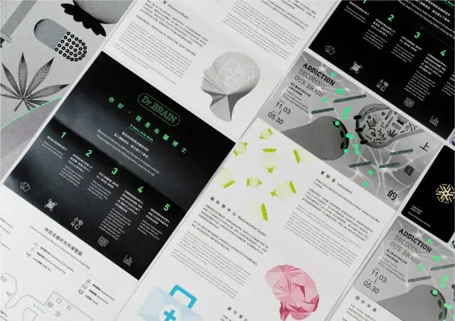 作品說明 Description:一般人對成癮的聯想通常是負面的,以致人們面對成癮相關議題時,常重視懲罰而非預防與治療。為撕開人們對「成癮」的標籤,正視藥物濫用和成癮所造成的社會問題。《上癮的科學特展》,從科學的角度切入,藉由研究成癮物質影響大腦的機制,解析人們為什麼會上癮。觀眾透過故事情境、解謎任務、互動體驗,認識有關上癮科學的各種已知與未知。展覽主視覺以神經突觸與各種精神作用物質及常見的藥物劑型,構成畫面中主要物件,表現腦中作用的機制。背景以神經元呈現腦中複雜的神經網絡,傳達成癮與腦的關係。畫面色彩以灰階為主,隱喻成癮與腦的作用是一連串漸變的過程,並輔以綠色圓點呈現腦中關鍵的神經傳導物質,形成強烈的對比,吸引觀眾的目光。