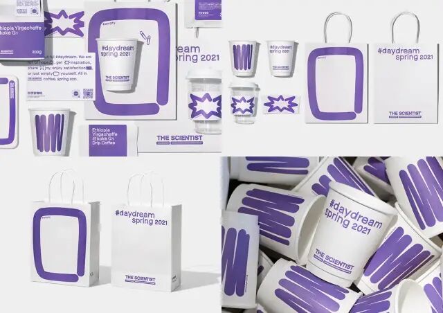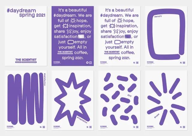 作品說明 Description:Daydream是科學家咖啡2021春季的新品推廣主題,這一季新品的特征是紫羅蘭花香,而daydream是紫羅蘭的花語。主視覺設計以手繪的形式勾勒了描述白日夢五種感受的圖形,並基於無襯線體的骨架手繪製作了主題字體,意圖向消費者營造出漫不經心的春季情緒,和產品味型形成呼應。